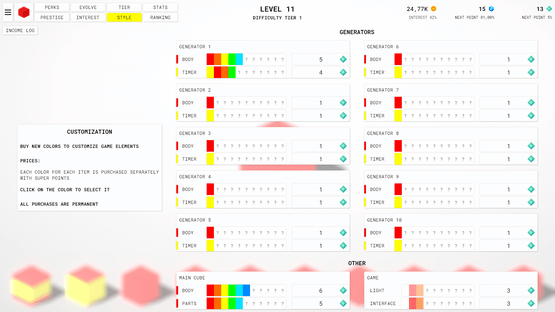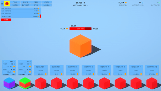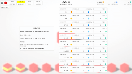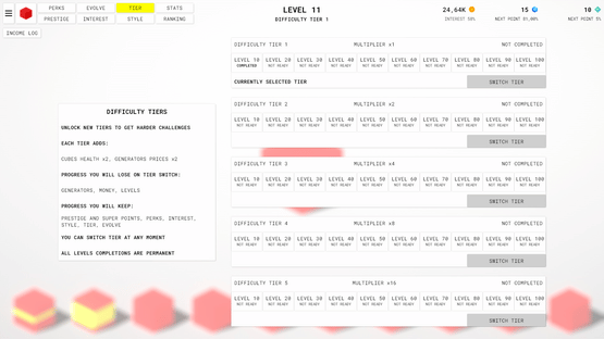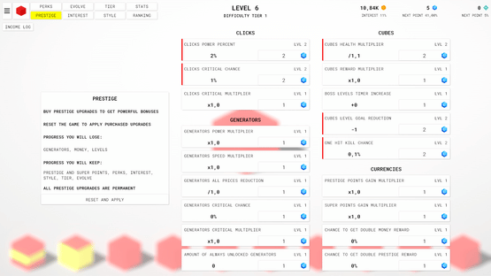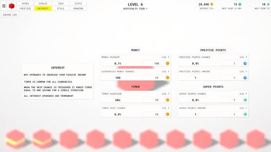 An idle clicker game with prestige, perks, interest, evolving system, difficulty tiers, ranking and many other features!
