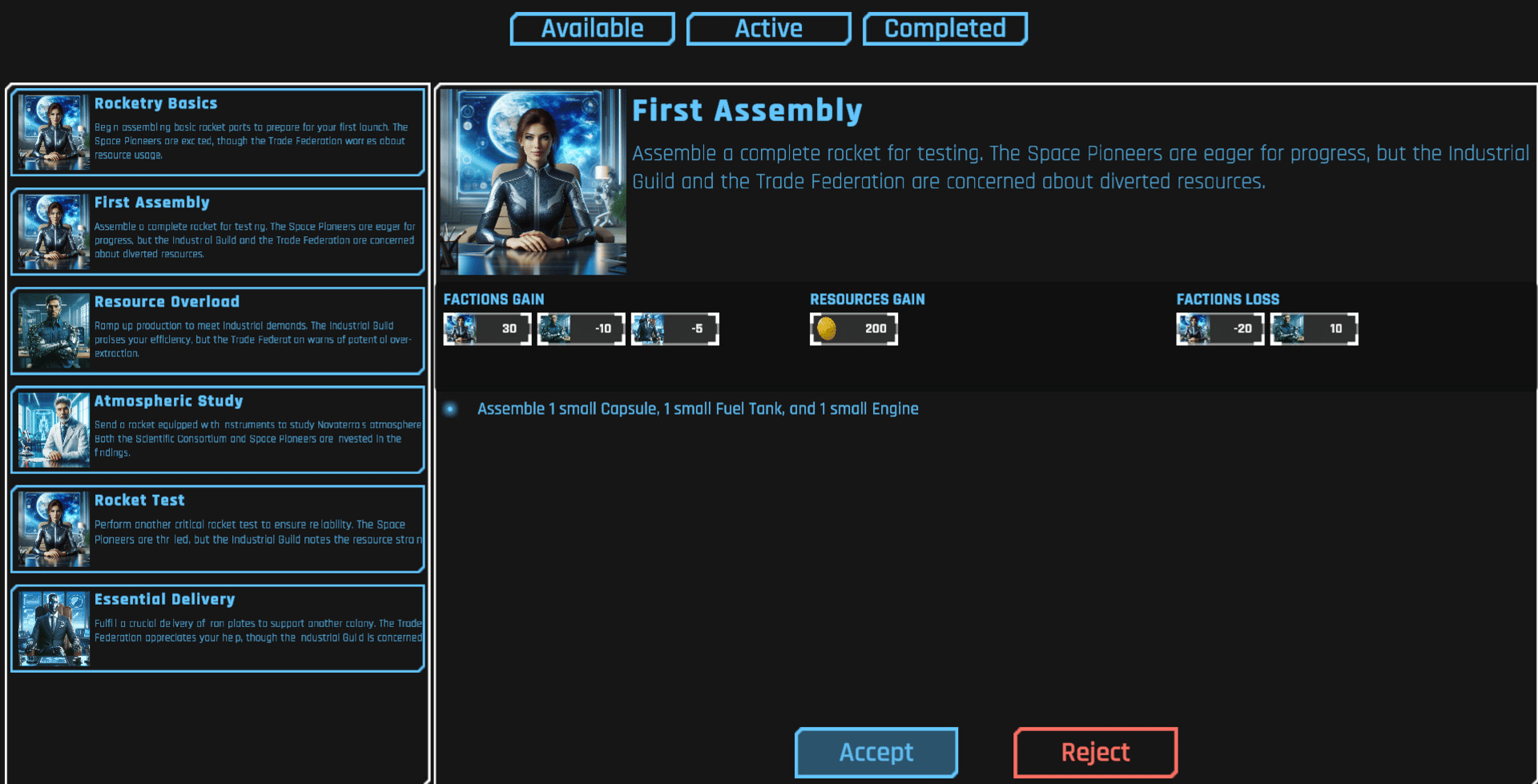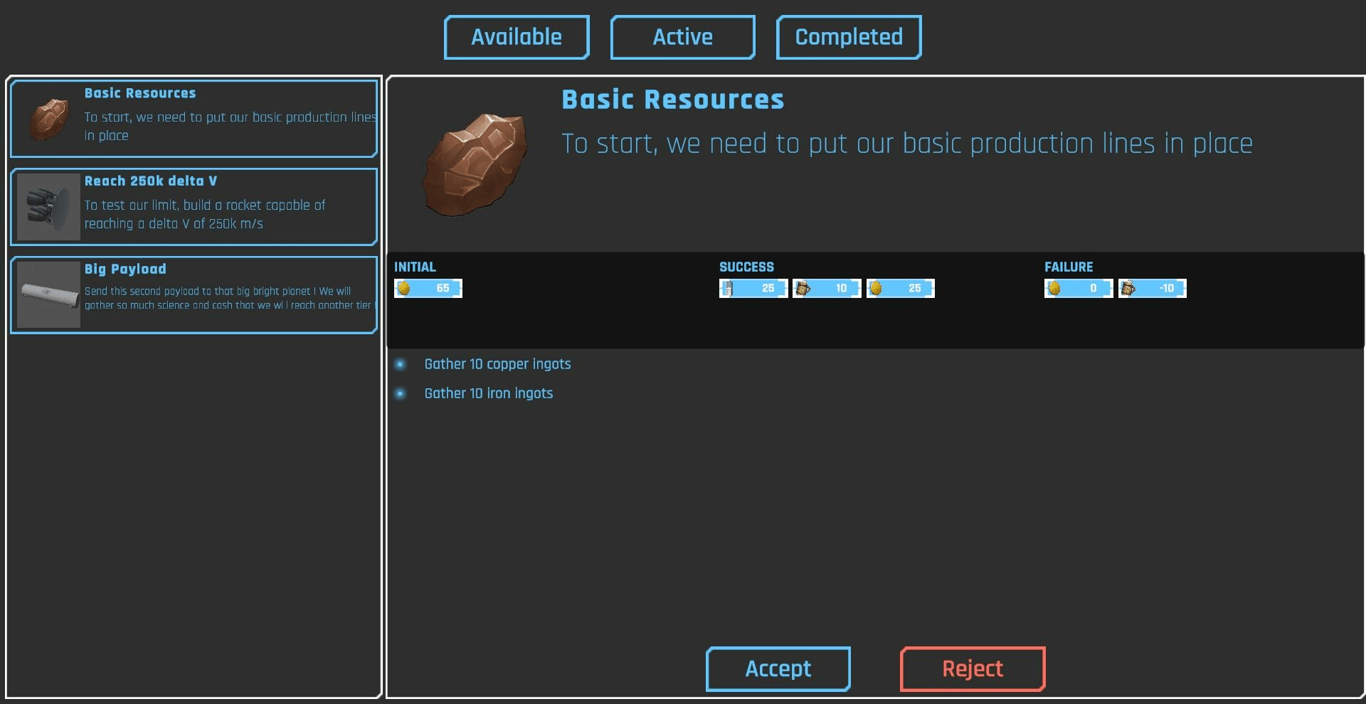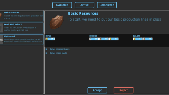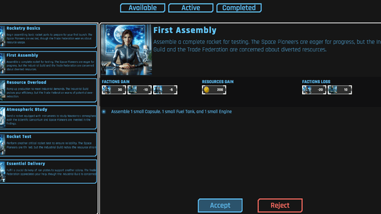 A factory building, space exploration and rocket construction game. Accept contracts from intergalactic factions to earn reputation and favours, design your own rockets, set up your production lines to automate your rocket construction, manage your resources and become the most reliable colony !