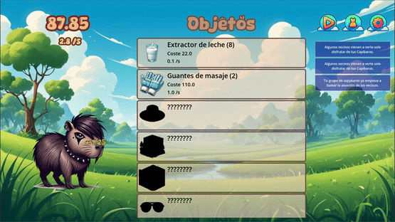 An idle game about Capybaras! You click in a capybara to increase your herd of capybaras! Every 3 and 24 hours, you get dropped a Skin. Collect all of them!