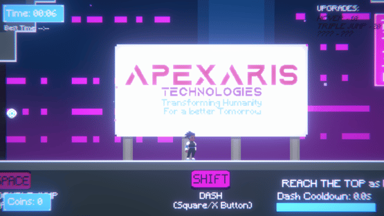 Climb your way up the dangerous Apexaris Technologies Tower for your only chance at a cure. Many have tried and failed, could you be the first? Careful where you step you could possibly fall all the way back to the start! avoid the zappers in each section, they will zap you back to an unfortunate location. Use your special high tech boots to traverse the tower with double jump/ Dash! combining those with upgrades like Hover, Triple Jump, and a Surprise! Warning: Rage may follow