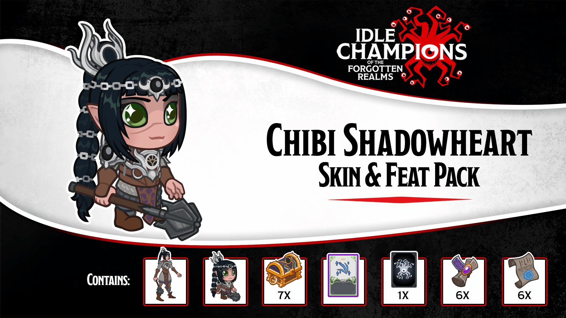 In this pack: Unlocks the Champion Shadowheart (if you don't already own them) Chibi Shadowheart Skin An Epic Feat for Shadowheart 7 Gold Shadowheart Chests 1 Guaranteed Shiny Equipment Card 6 Epic Blacksmithing Contracts 6 Epic Bounty Contracts