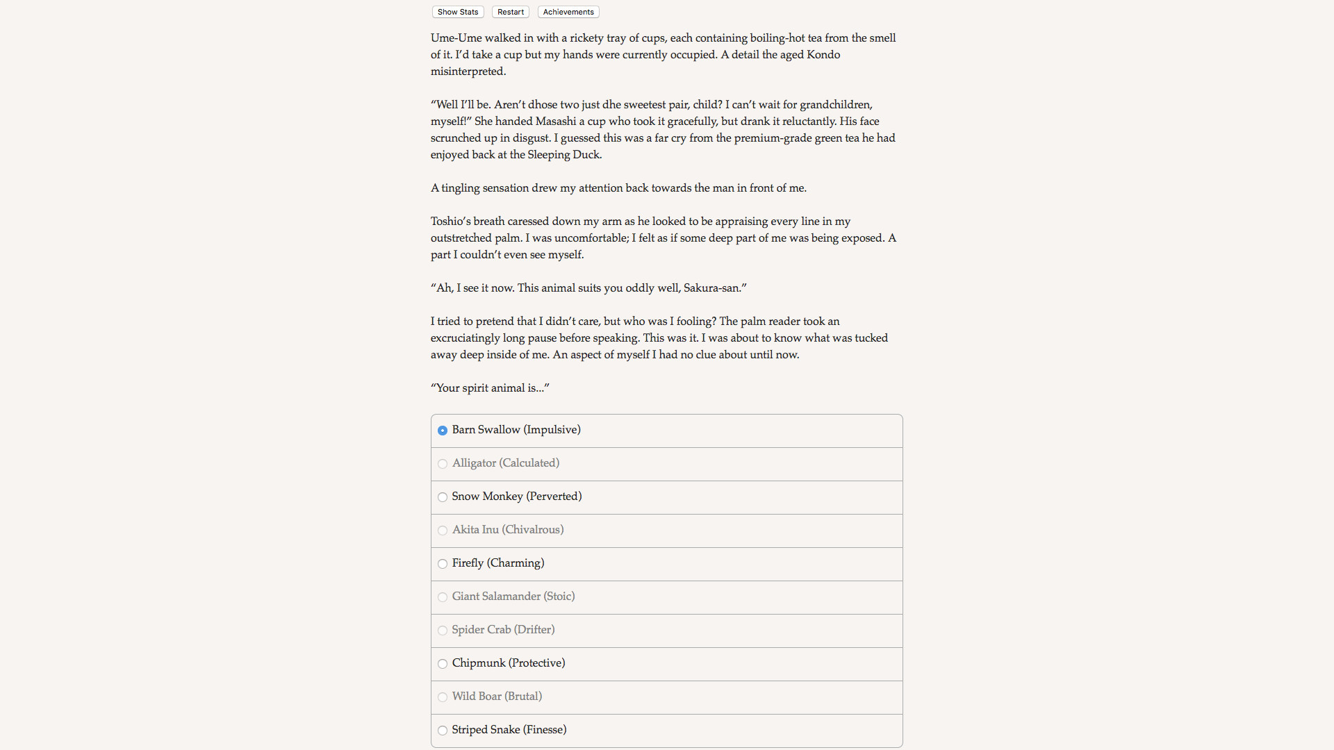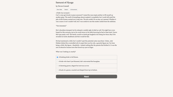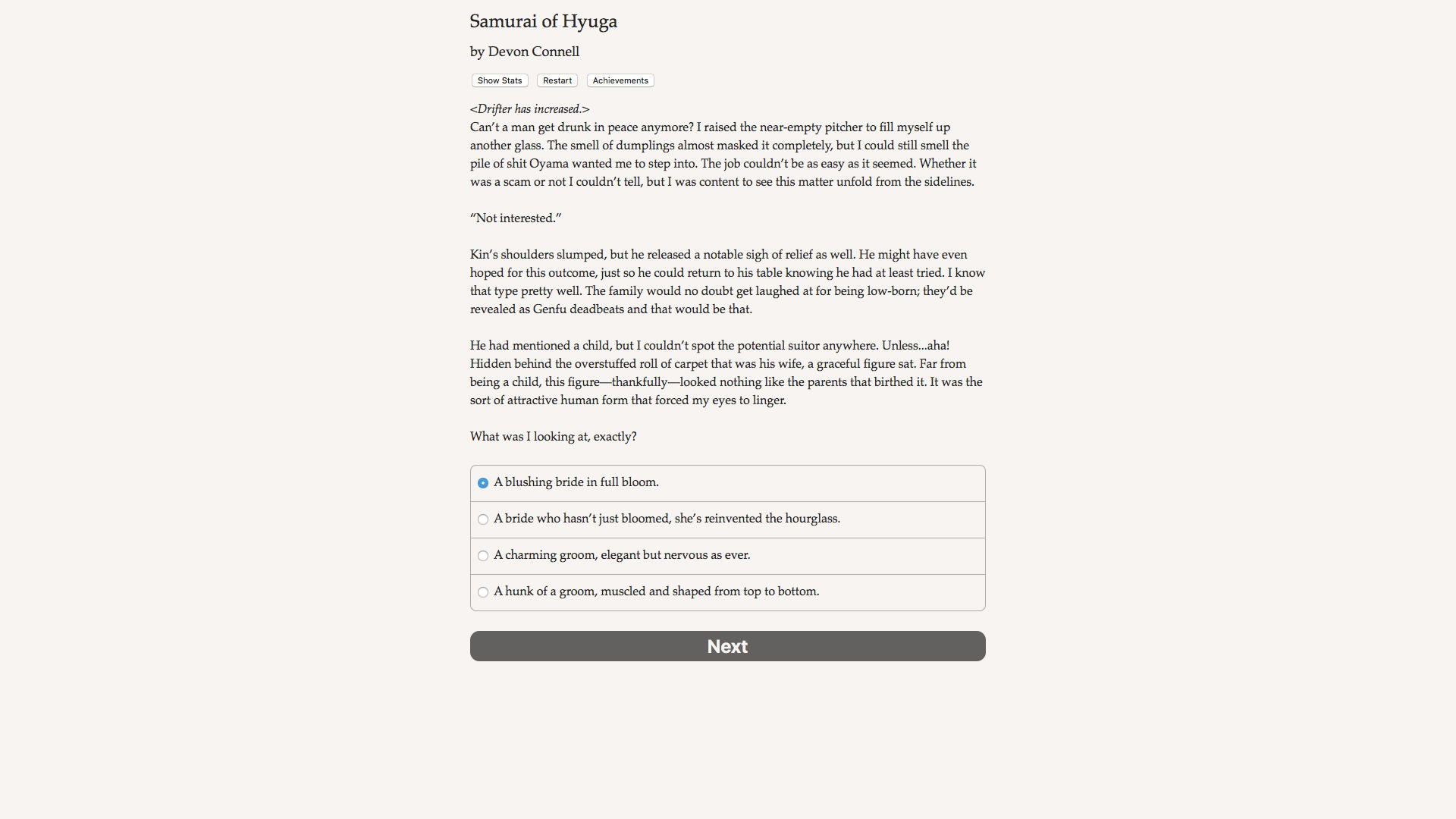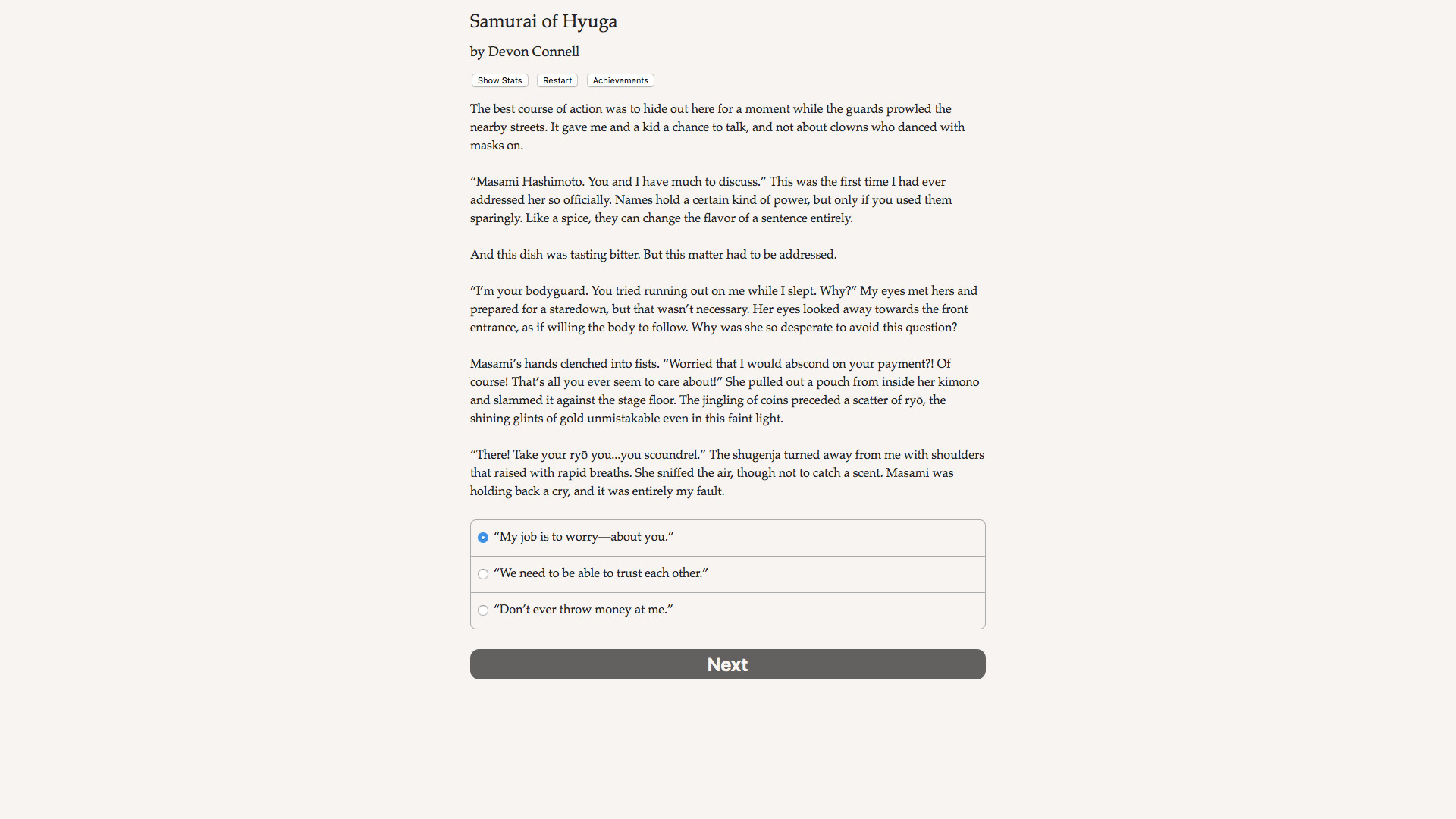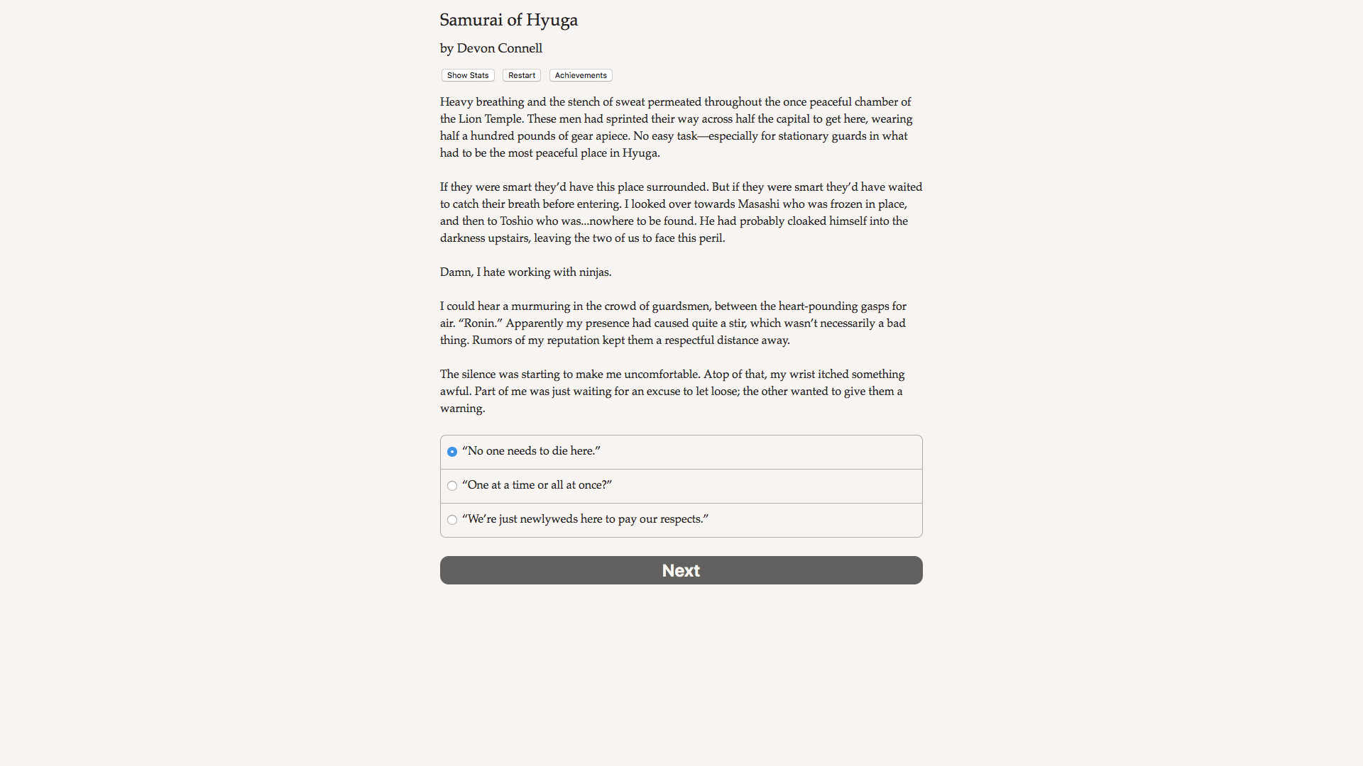 Samurai of Hyuga is a brutal, heart-pounding interactive tale. Prepare to enter the land of silk and steel, where fantasy clashes against grim reality, and where the good guys don't always win in the end. It's a harsh world with tough choices at every turn. Good thing you're the toughest ronin around.