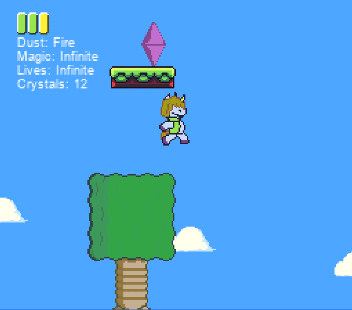 A small platformer inspired by old-school speed games. Help Stardust rescue his friends from the Kelpie Kingdom using his speed, horn, and magic dusts that grant him different abilities. Jump around, run, and use your abilities to advance through the levels. Watch out for obstacles and use different dusts to help you progress. Different dusts grant you different powers, which you can use to your advantage. Try them all and use your favorite one.