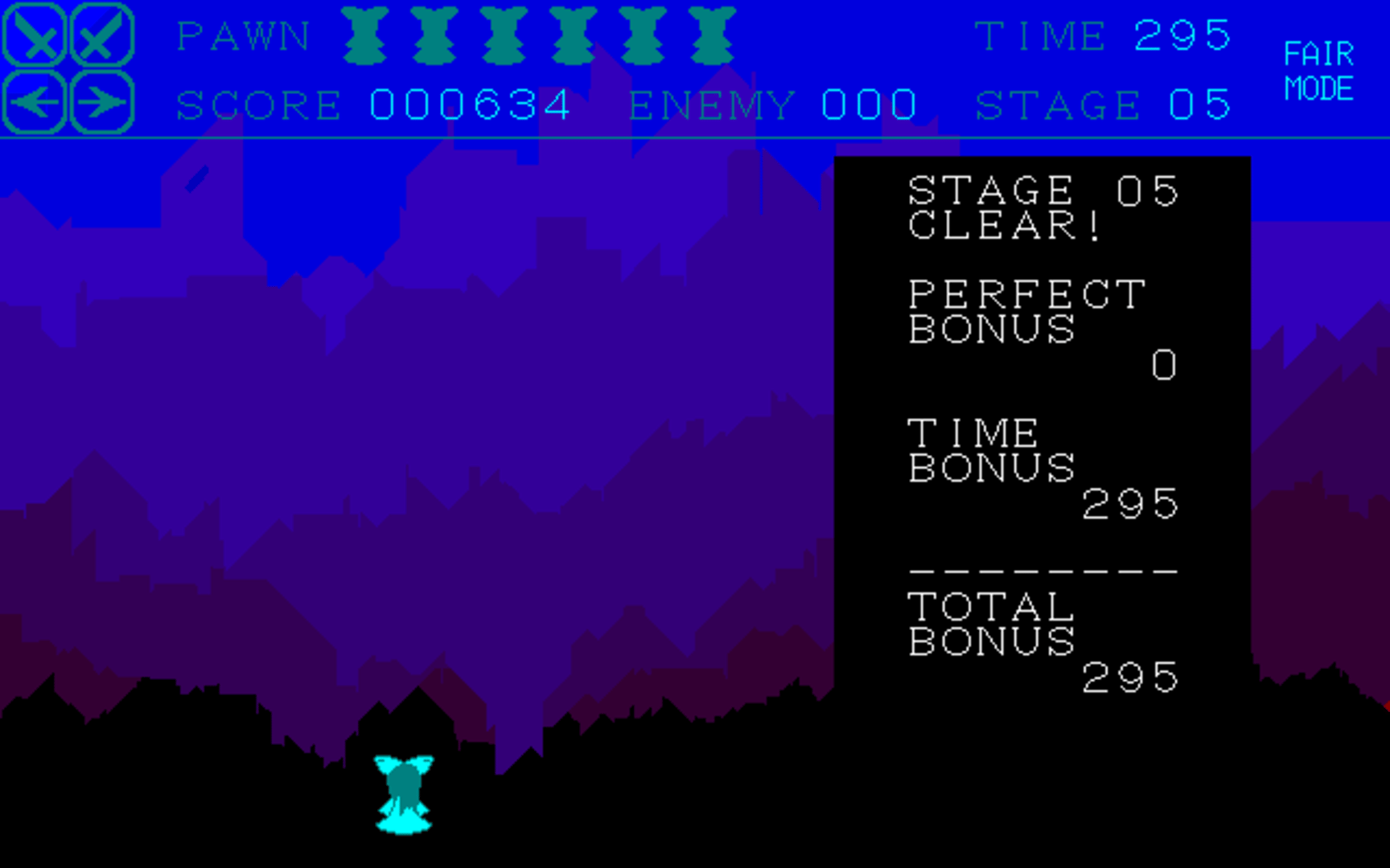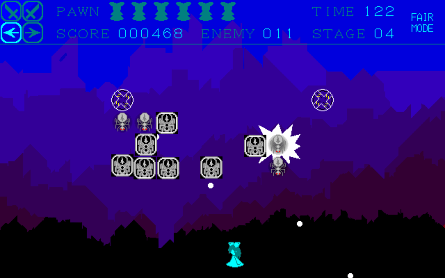 Sunrise Doll is a single-screen 2D game in which you control the swordsman known as Pawn. The goal of the game is to clear all levels in a sequence. To clear a level, Pawn must defeat all enemies in the level. To defeat an enemy, Pawn must use her sword to reflect projectiles back at it, and then collect its soul. There are various enemies that have different behaviors.