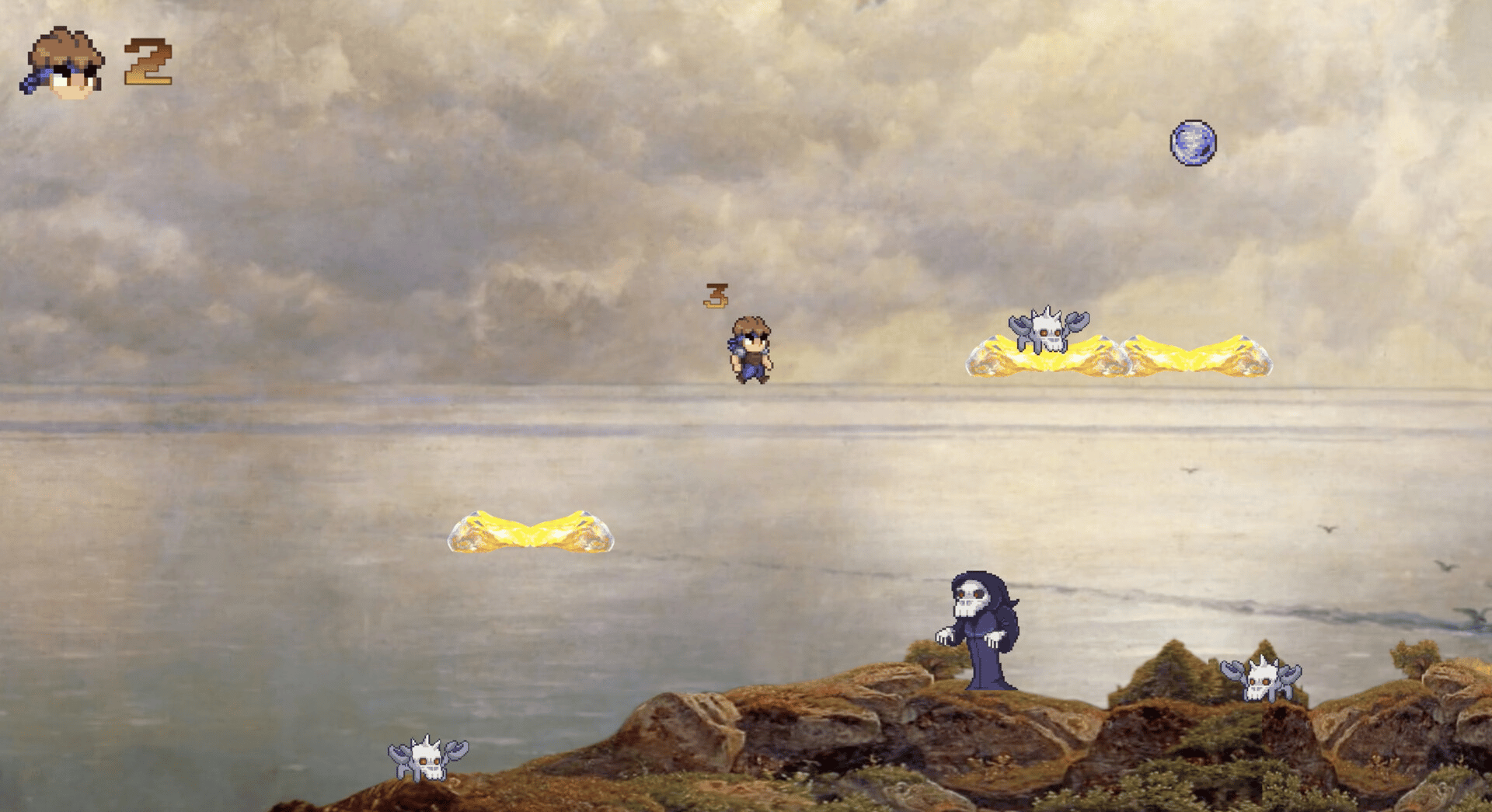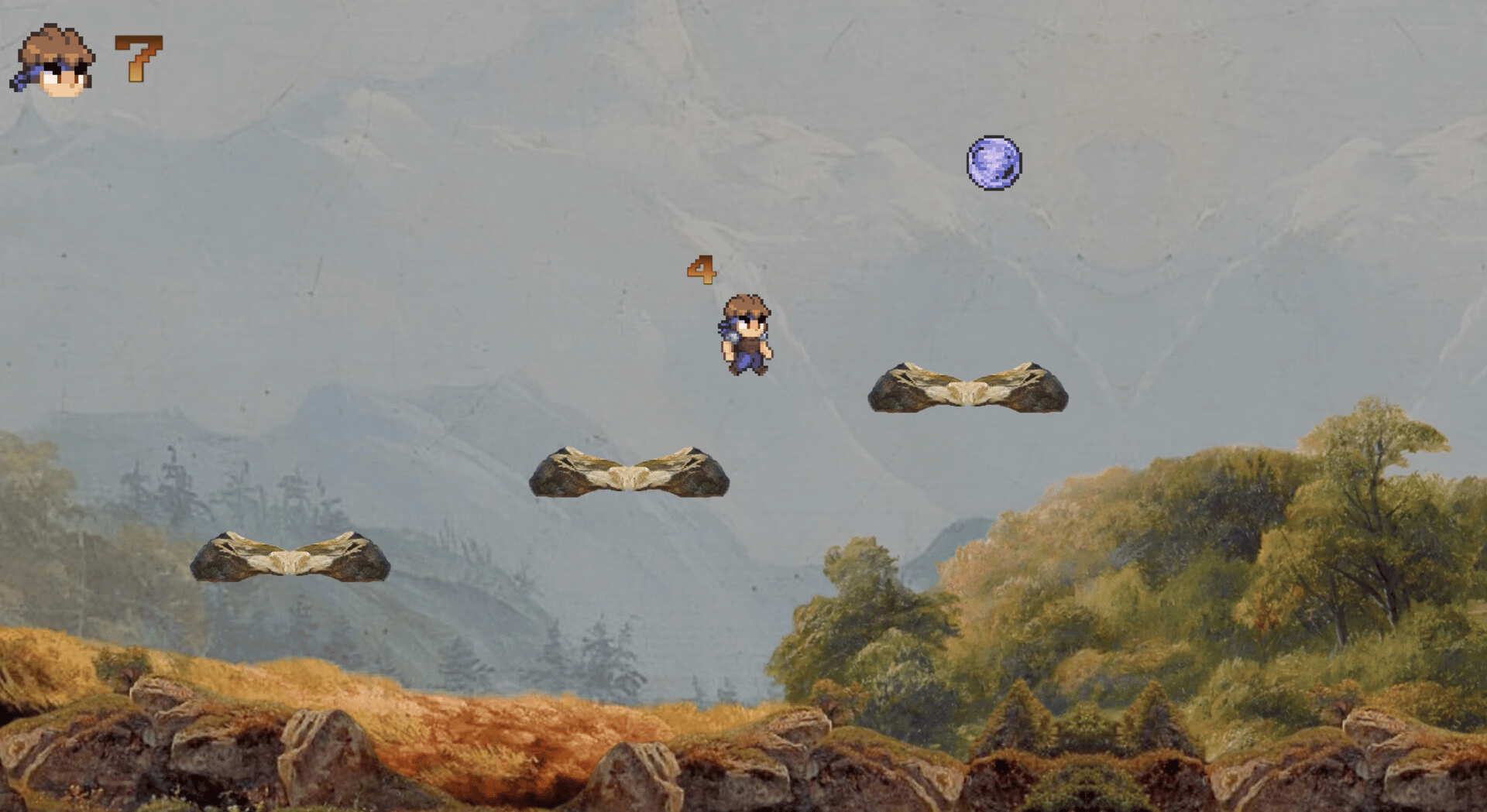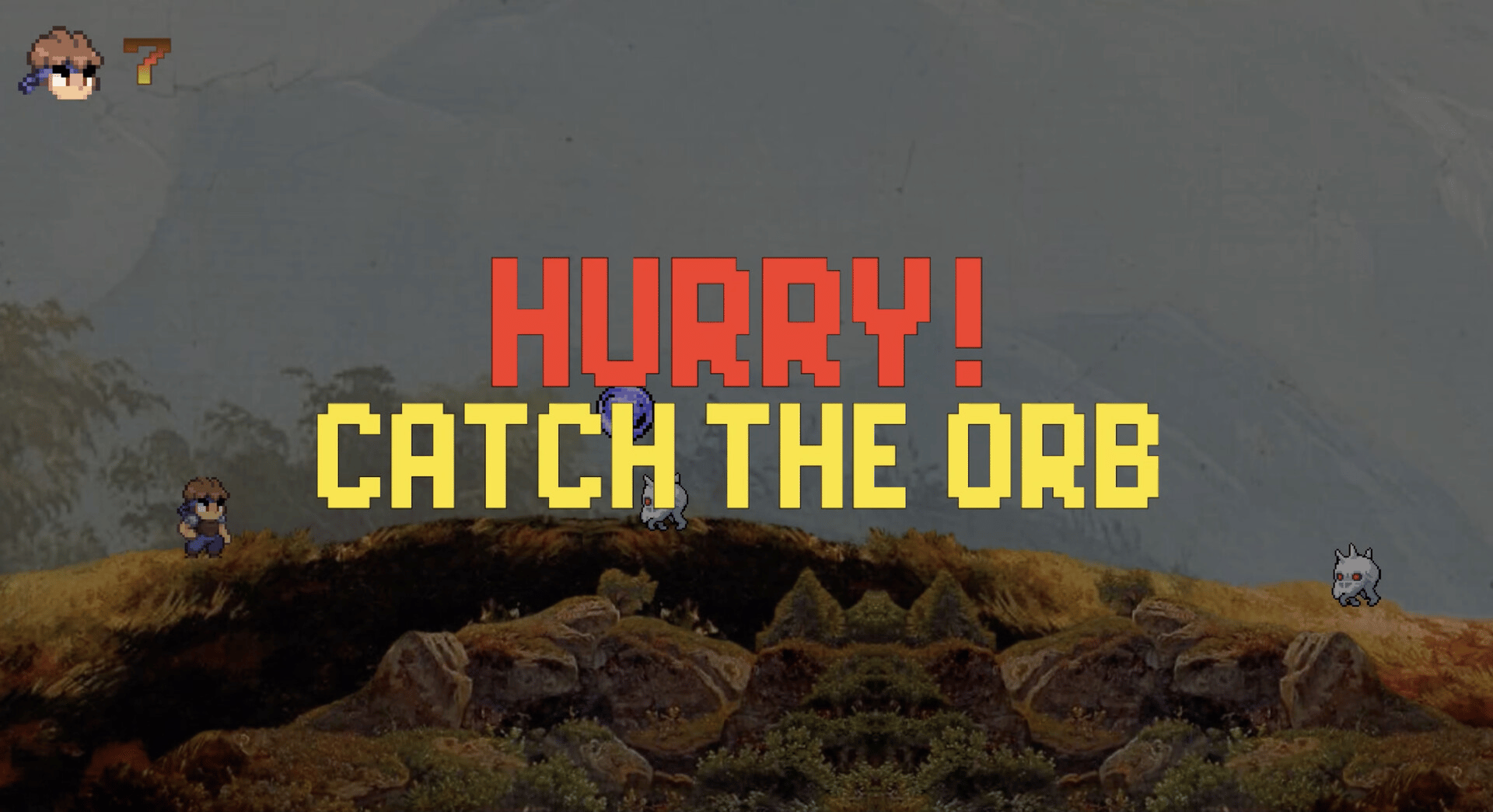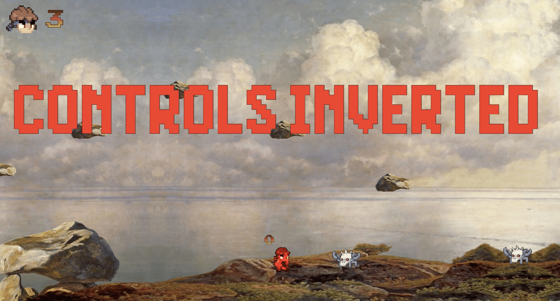 Shadow Dash is a retro 2D action platformer with pixel-art characters on oil painting backgrounds and changing game controls.