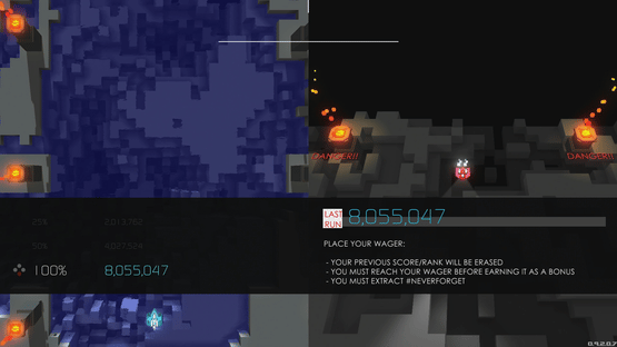 Split-screen single player twin stick risk 'em up. Your score is meaningless unless you exist. Playing till death will leave you scoreless and will also wipe your previous position from the leaderboard. Don't lose sight of your mission. Trackher.