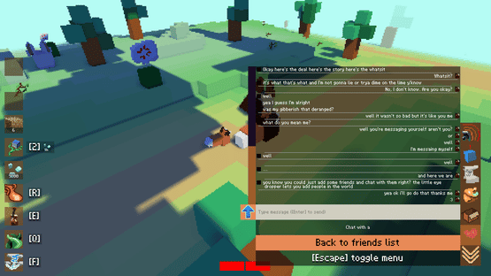 A feel-good MMO with rich mechanics. Paint with your friends, play a cube violin in the woods, discover an ancient ruins, fight valiant knights and dangerous mobs, become a fox sacrificing yourself to a dangerous altar at midnight, chill with a fishing rhythm game, upgrade your gear and character.