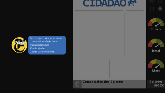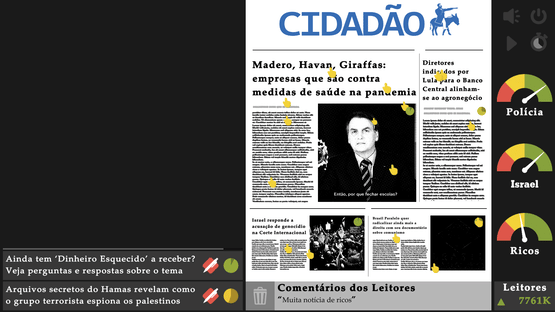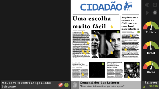 Adapted from Molleindustria's The New York Times Simulator, Cidadão de SP Simulator is a newspaper simulator where you assume the role of a newly hired editor. To keep your job, you have to make three layers of society happy: The rich, Israel and the police.