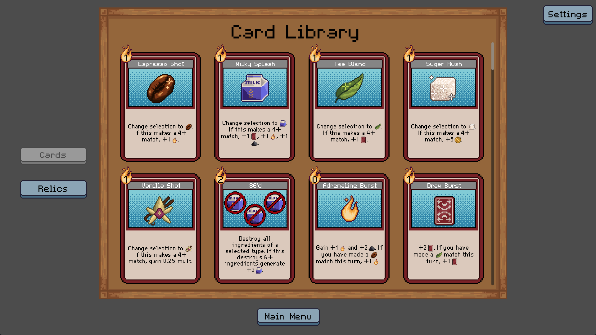 Hone your barista skills to smash daily goals and stave off the thirsty masses in this rogue-lite match-3 deckbuilder. Play your cards right to clear ingredients, beat increasingly demanding quotas, unlock passives, and make it through the work week.