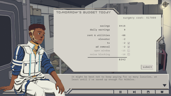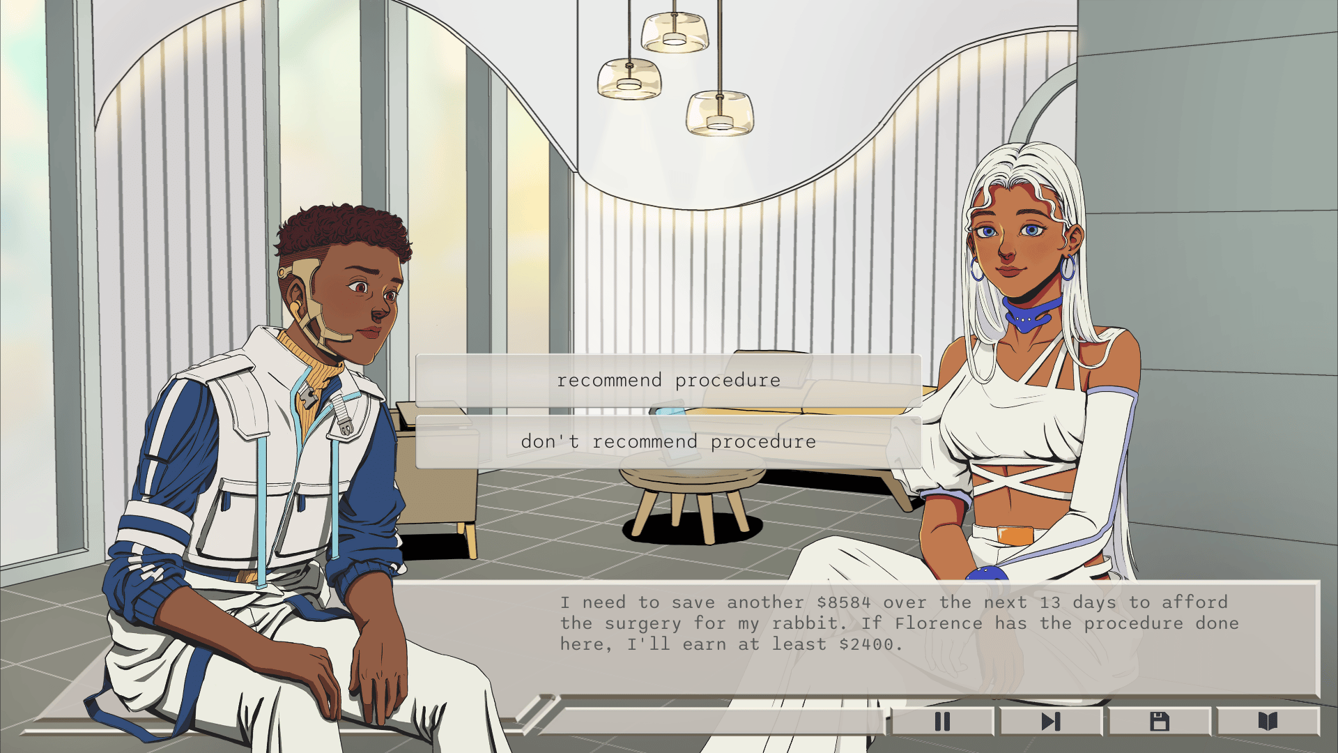 Work as a body modification consultant in a dystopian future. Talk to clients, make recommendations, and decide how much to upsell them. Your choices will impact each of their lives. Balance helping others with earning enough to save your sick rabbit.