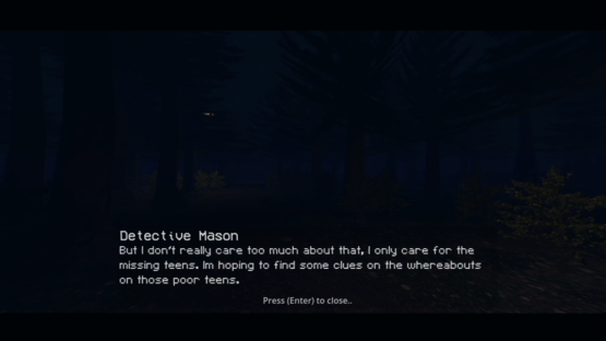 You play as Detective Mason, an investigator determined to solve the chilling mystery of the disappearance of three teenagers. Their last known location was in The Whispering Pines Forest. Will you find those poor kids or is it too late?