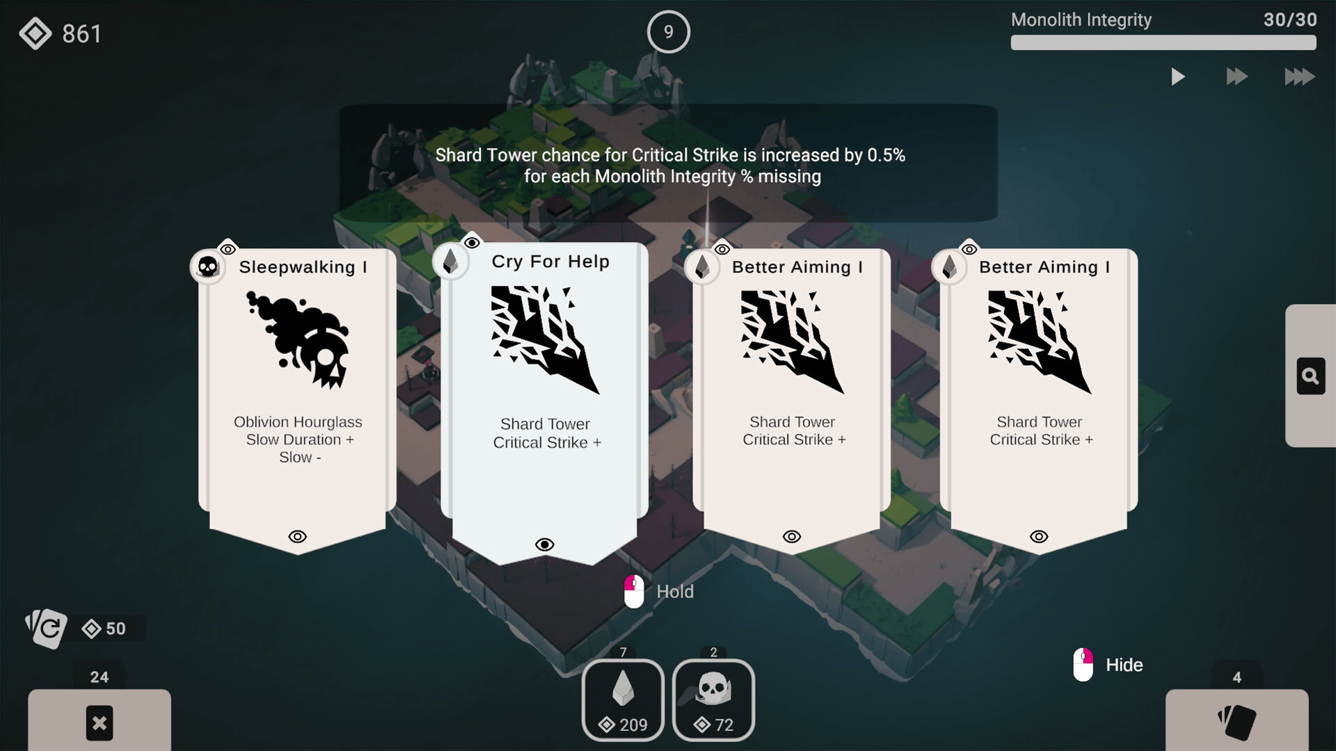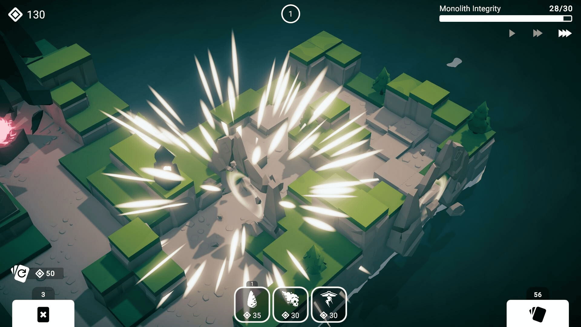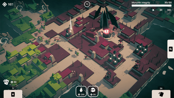 You are the Wandering Monolith, falling from the sky. Summon towers, expand the board, defend your core, and build your deck of upgrades to conquer countless worlds.