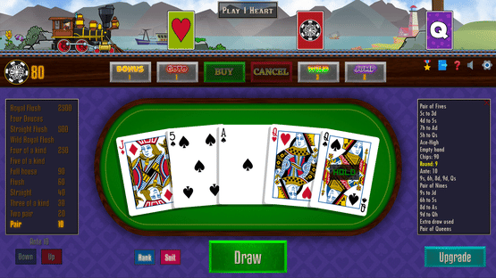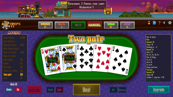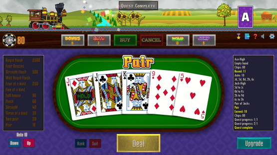 Poker Train is a video poker game where you must play scoring hands to keep the wheels turning. Use your best combinations to build steam and run the train as far as you can. Complete quests and find all the secrets the railroad has to offer!