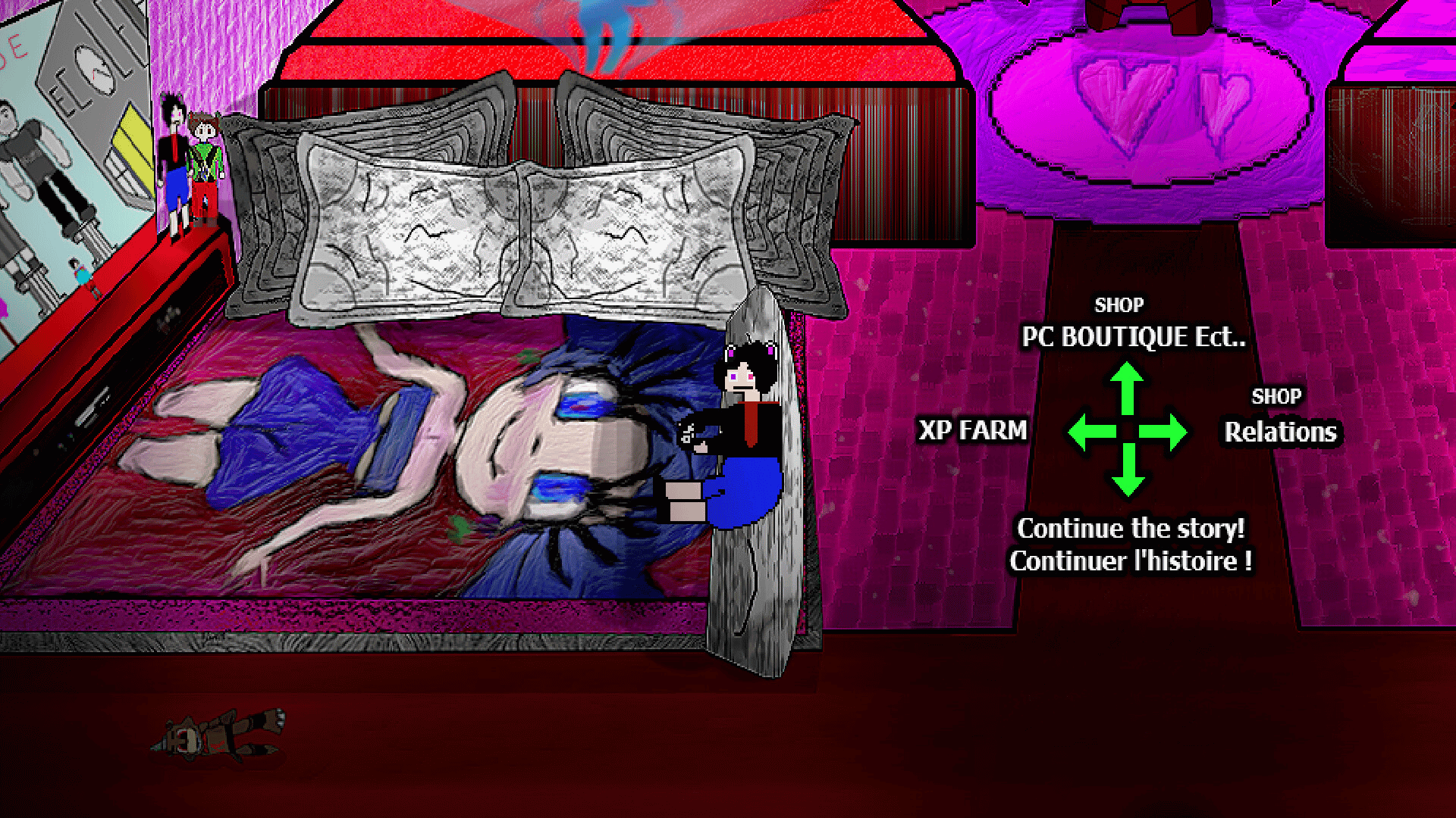 Cute horror choice game with a lot of varied gameplay, from bloody battles to platforms. Come break the fourth wall that separates us! Choices that have real impacts, charming characters, a blend of retro and realistic video games. Come meet Résop and Paz.