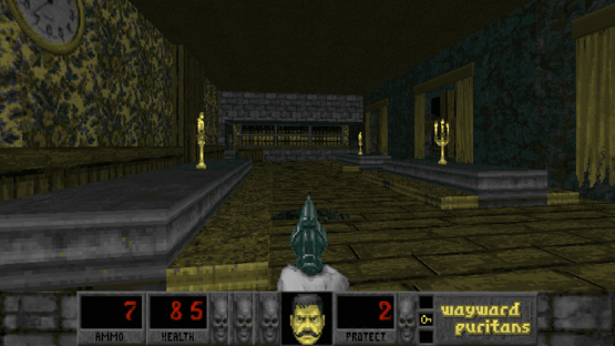 Wayward Puritans is a spooky, survival horror-inspired single level for the Doom 2 IWAD, with an ending map in MAP02. Explore a creepy mansion, uncover the secrets of an ancient cult, and fight for your sanity against forces more terrible than social science can theorize! Taking inspiration from Resident Evil 1 and cosmic horror, combat has been extensively retooled, so be prepared to make due with more meager resources than your usual Doom map.