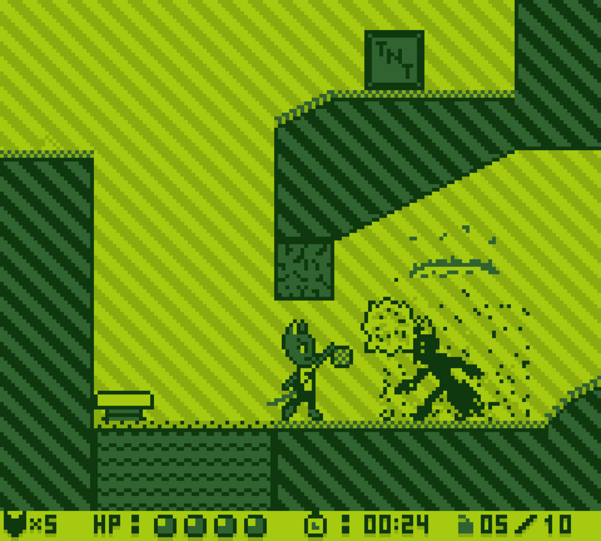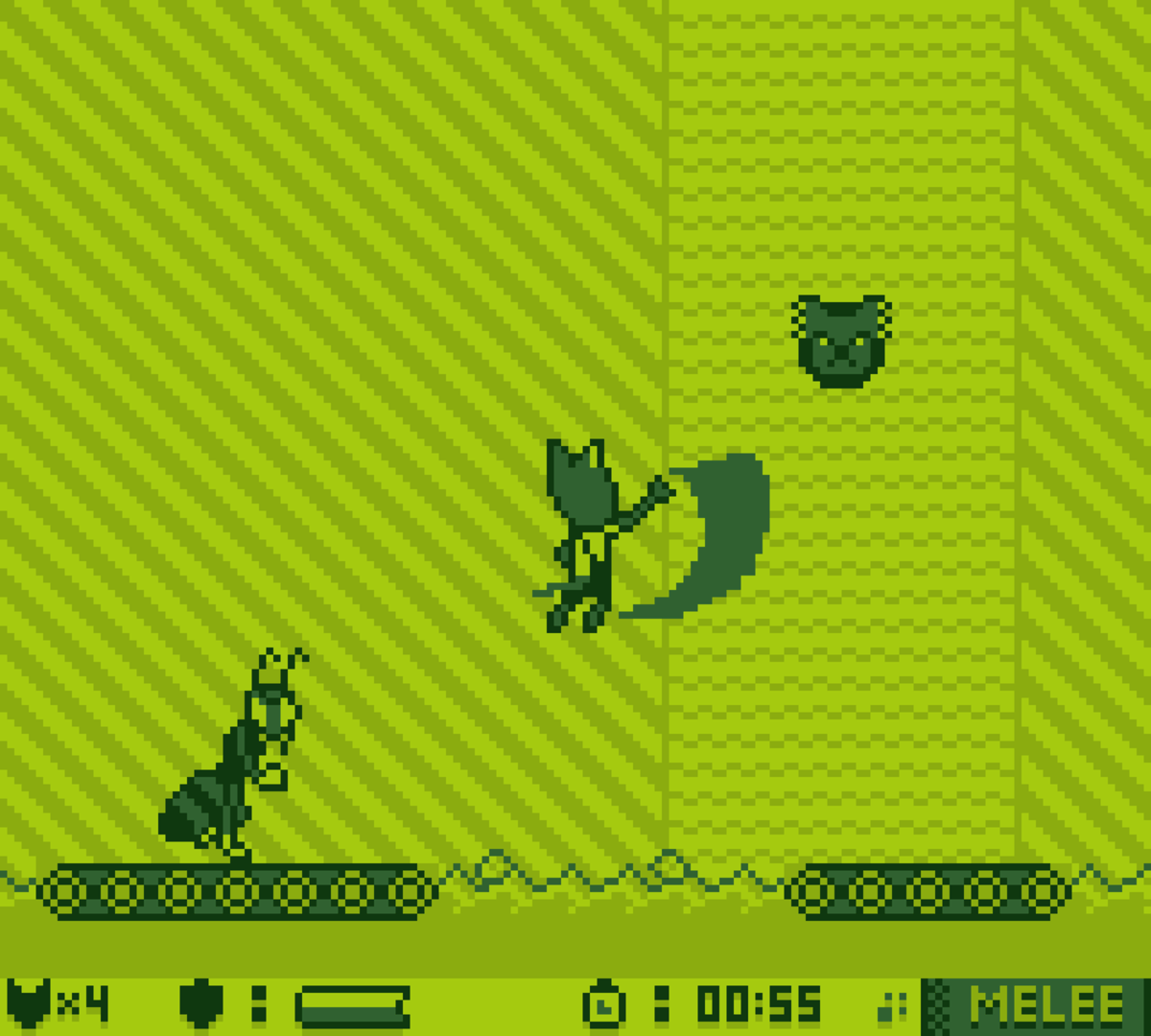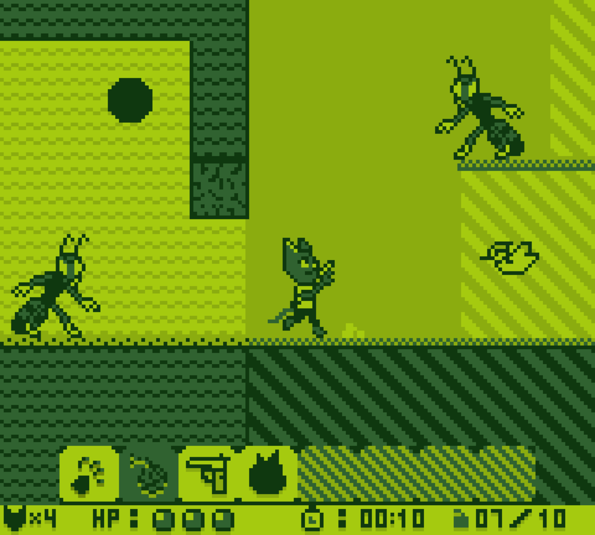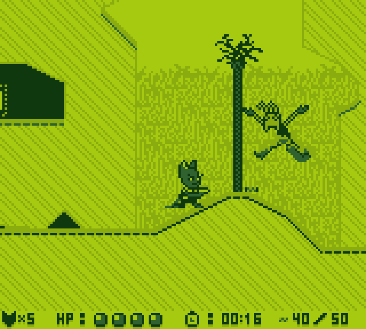 ChronoVenture is a momentum-based Gameboy-style platformer shooter where the player controls a cat named Lizzy as she runs, jumps, claws and shoots her way to the end of the level where she'll encounter against a boss to unlock a new weapon or ability before she finds herself warping into the future. Taking inspiration from Sonic CD, you start off in Act 1 during the present or past of a stage where you can either focus on completing an objective that changes the future in Act 2 for the better or reach to the end as fast as you can for a tougher challenge.