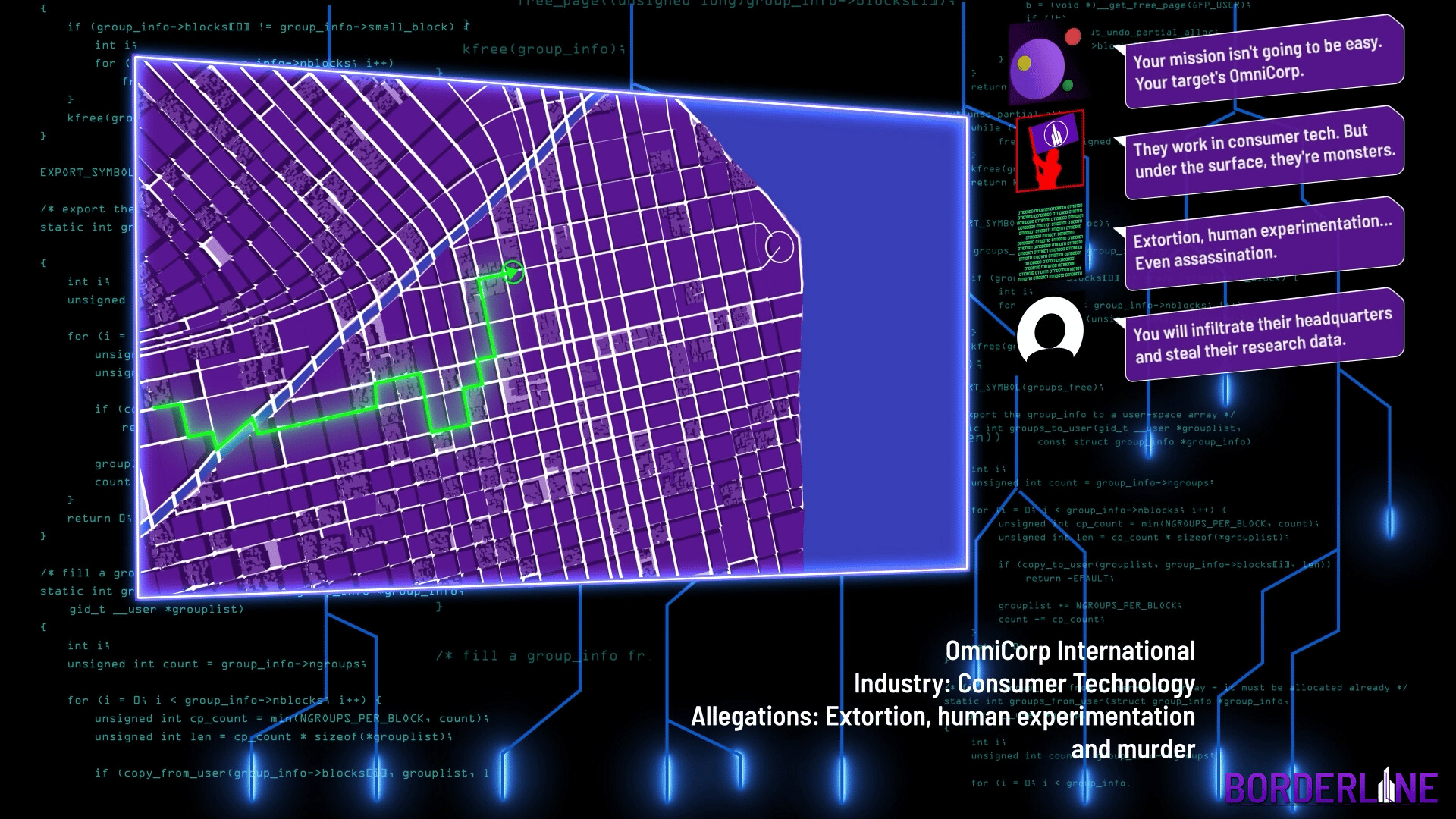 Borderline is a free running first person adventure heavily inspired by the momentum-based gameplay from Mirror’s Edge. You are tasked with working against the city of Greyhawke’s most notorious mega corporations, uncovering their secrets while navigating through their state-of-the-art security.