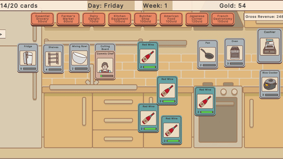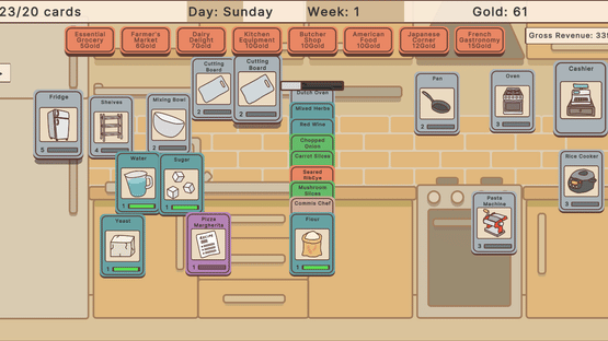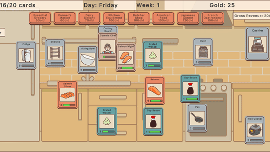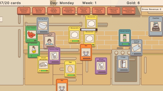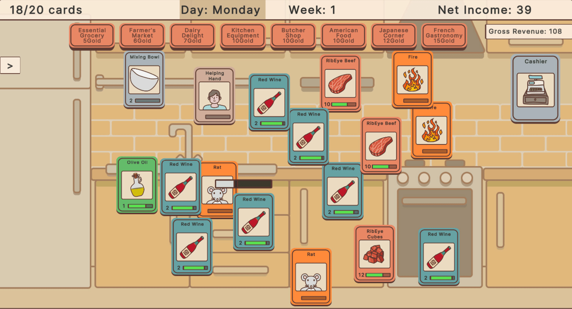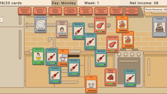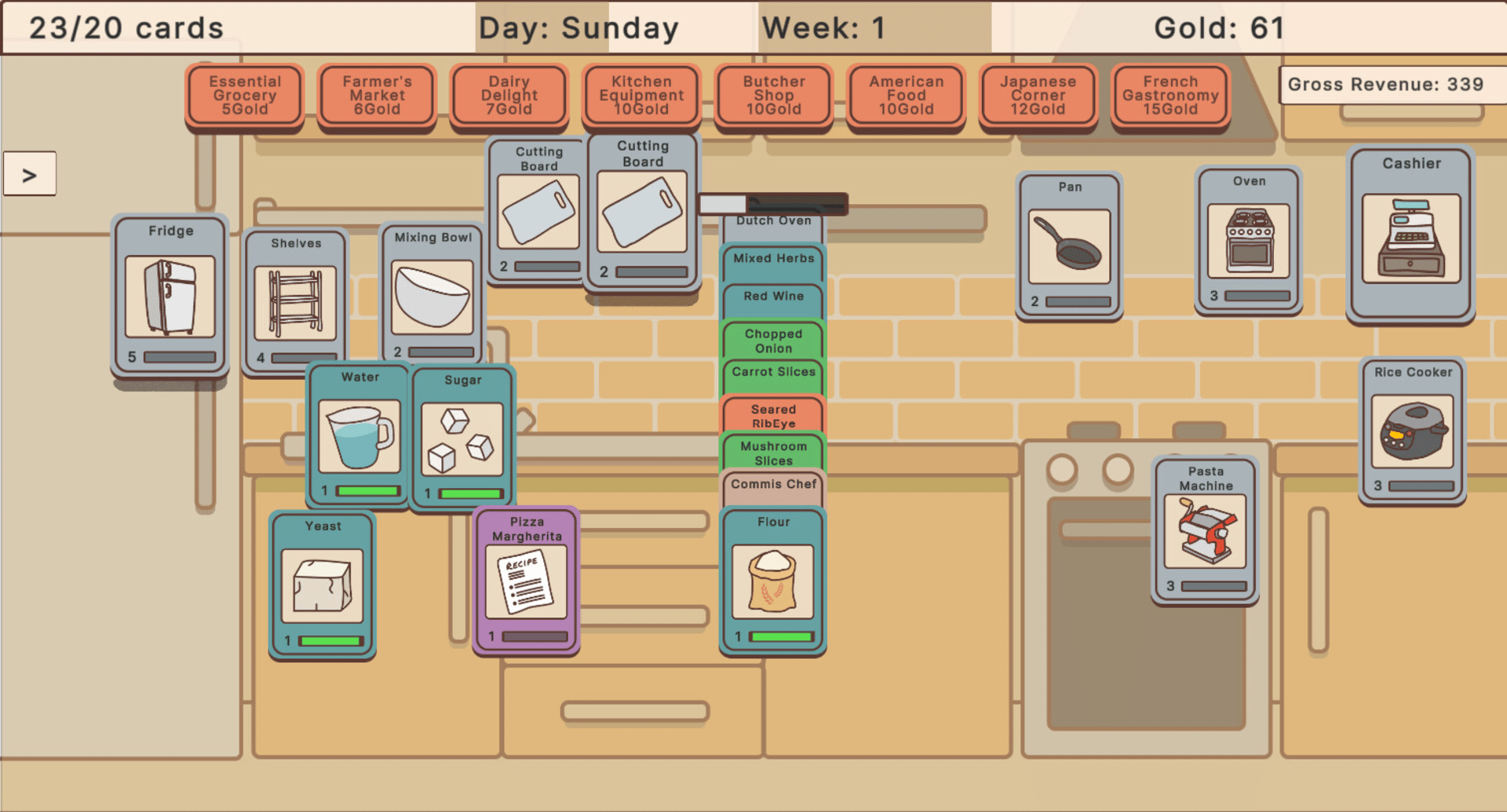 Culinarium is a card management cooking game where you stack ingredients to create recipes and cook dishes. For example, if you cut some Salmon slices on a cutting board and stack them with rice, soy sauce, and wasabi, you'll make a Salmon Nigiri.