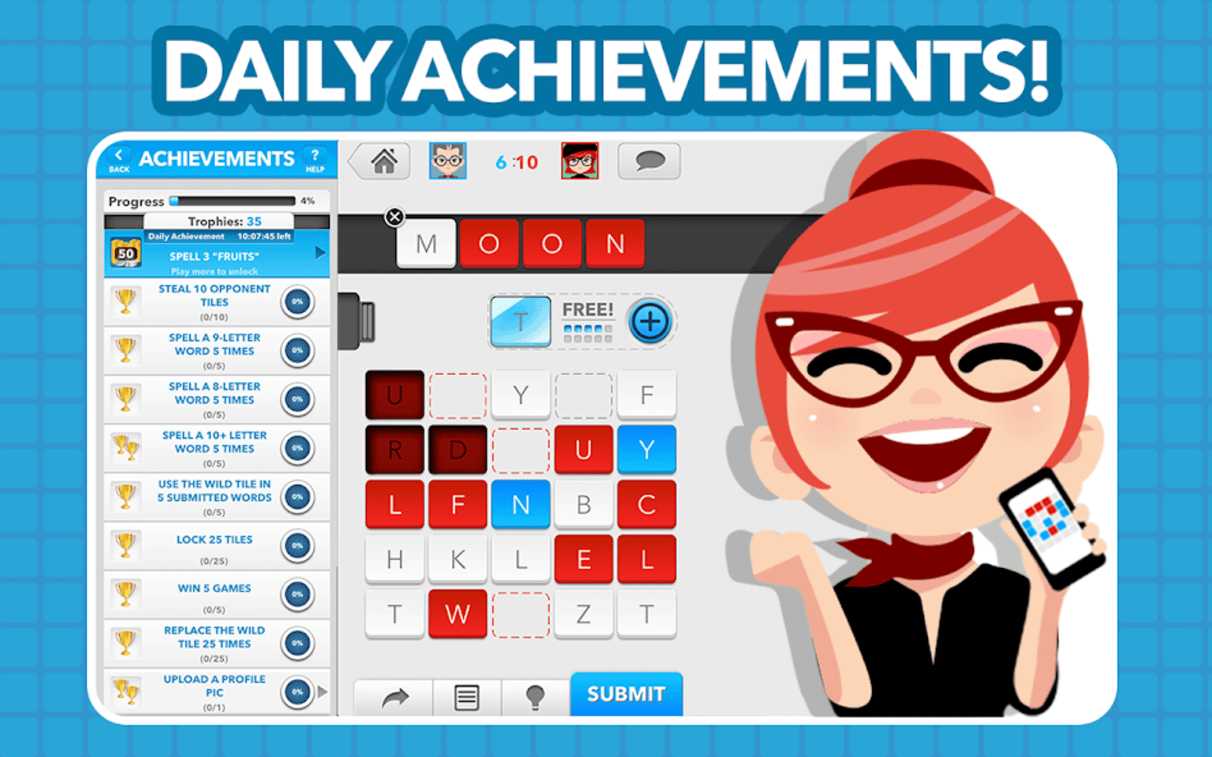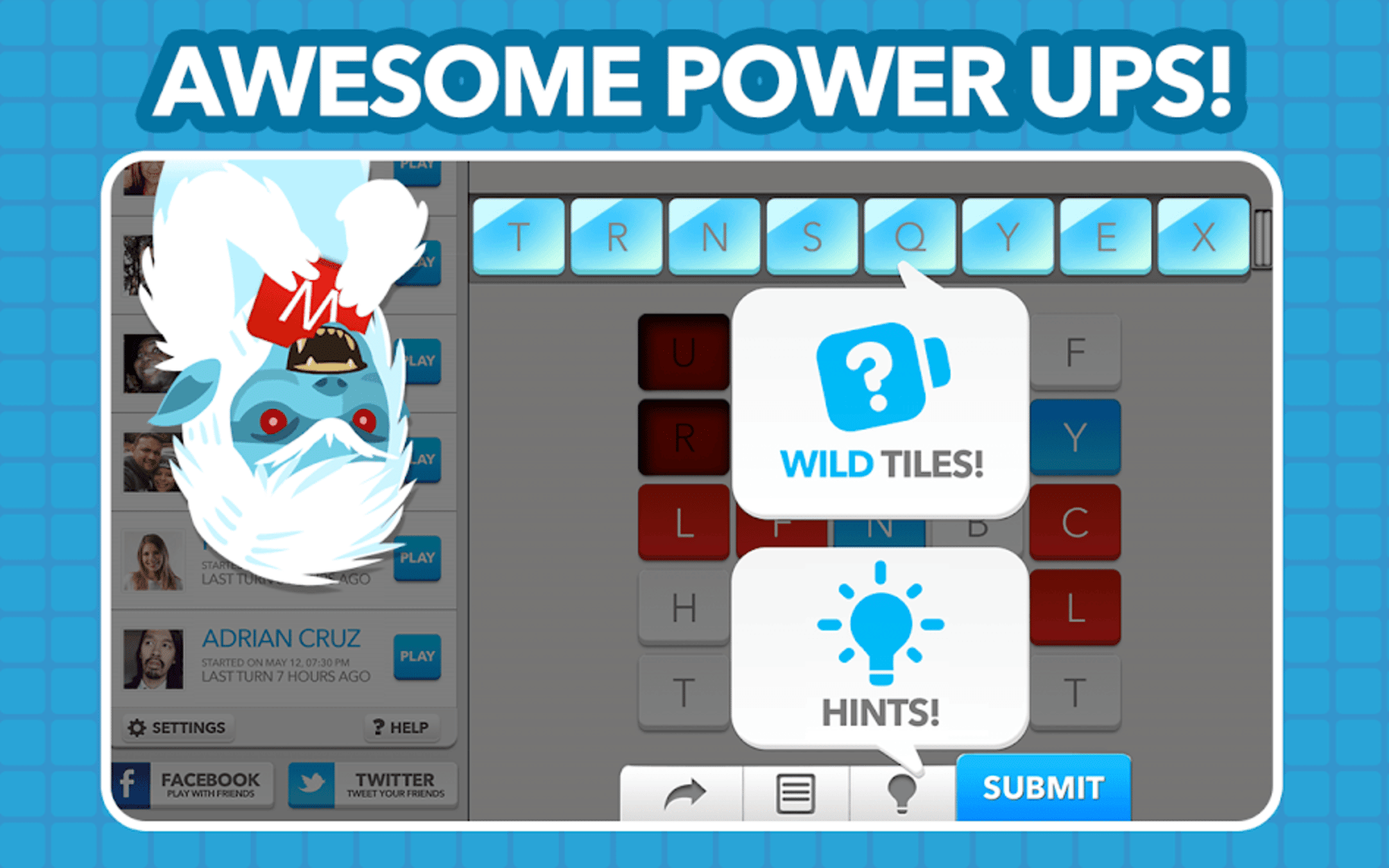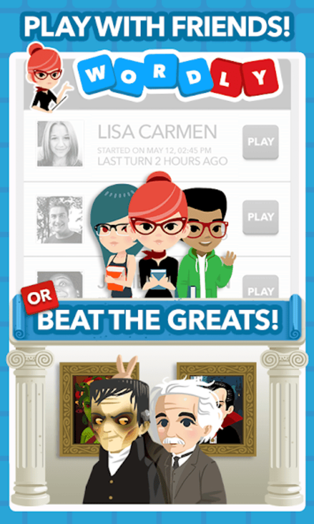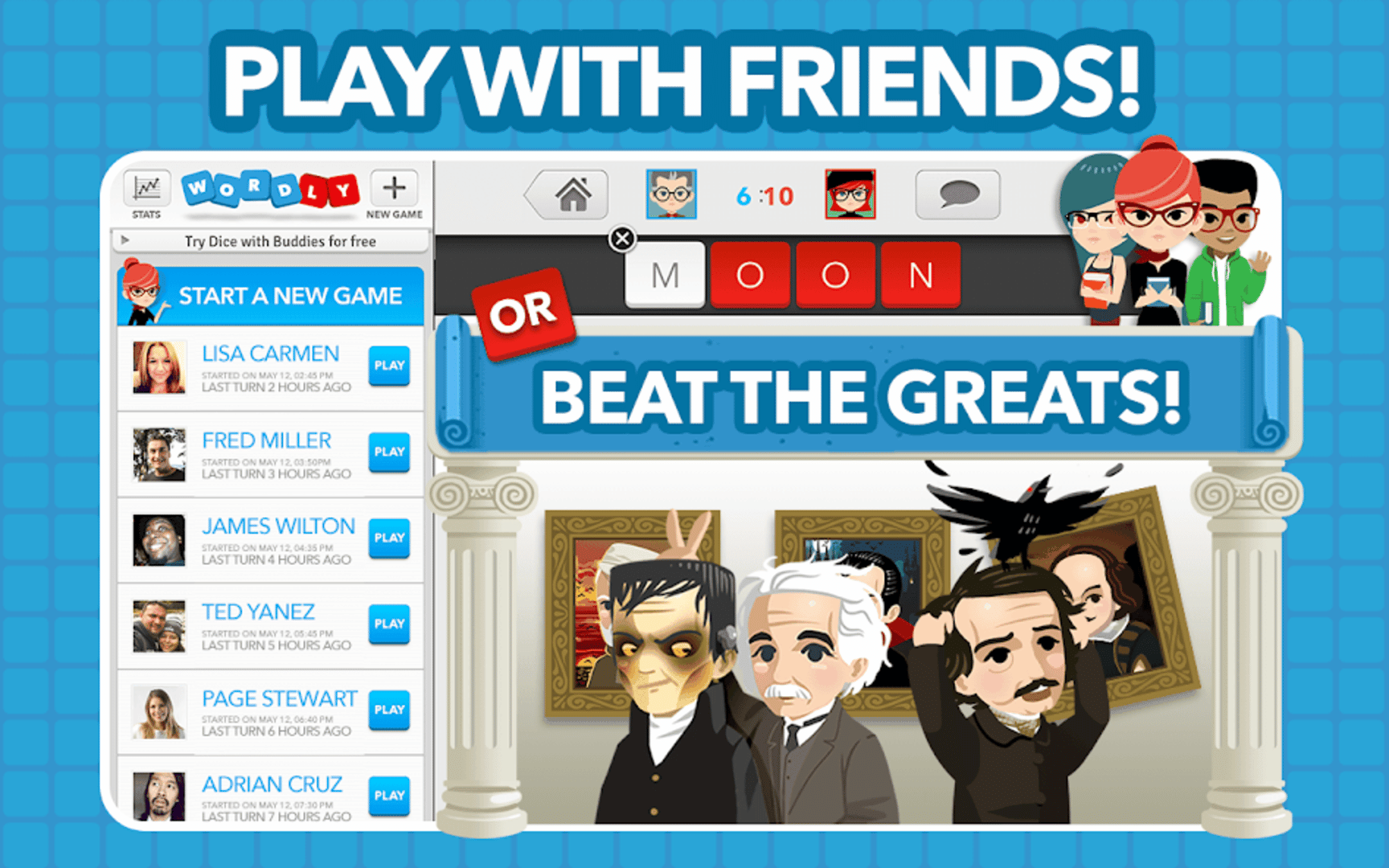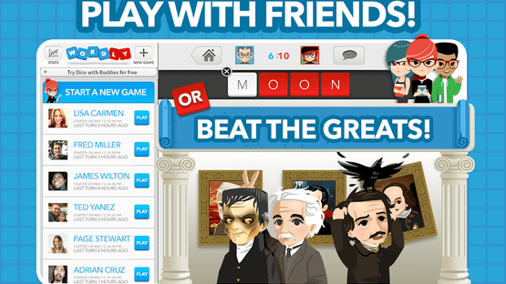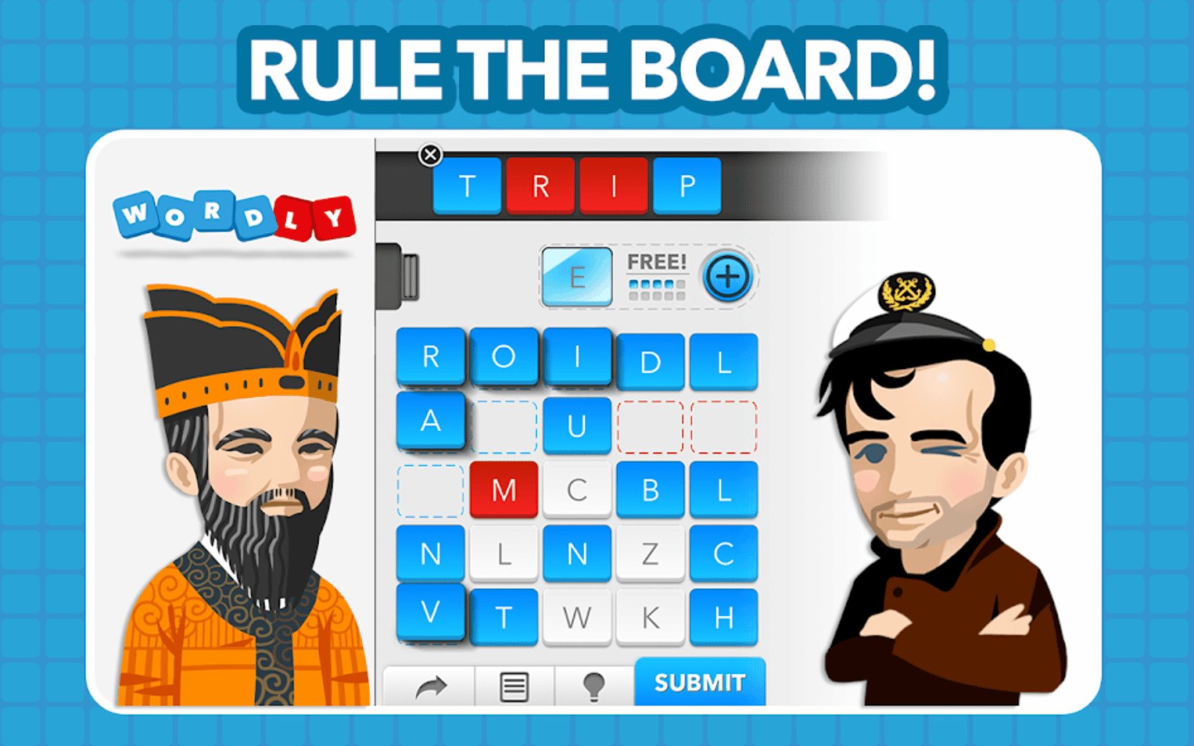 Spell the longest words possible, claim your opponent's tiles, and dominate the board in this exciting letter landgrab game. You can play against friends and family everywhere, on both smartphone and tablet, and challenge historical and literary greats -- such as Shakespeare, Cleopatra, and Count Dracula -- in "Play the Greats" mode, Wordly's awesome single-player experience.