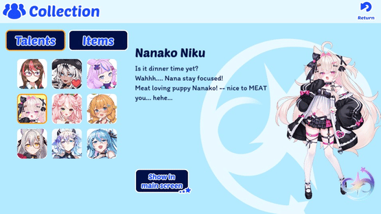 Stellar Verse Runner is an infinite runner style game featuring the VTubers from the EN VTuber company, Stellar Verse Productions. Players unlock the talents by collecting items associated with the talents in the runner mode. Those items can be used in an hatching mode to unlock the talents to use as new characters in the runner mode. The runner mode has 3 lanes, 3 different heights of obstacles, and accomplishment can be measured be score or distance.