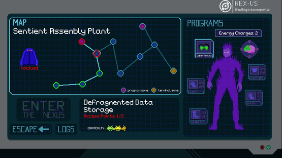 Hack your way through the Nex-Us in this turn-based puzzle game. You'll face obstacles like bit barriers, lasers, and digital monsters, all trying to slow you down before the DoomWall catches up and forces you out.