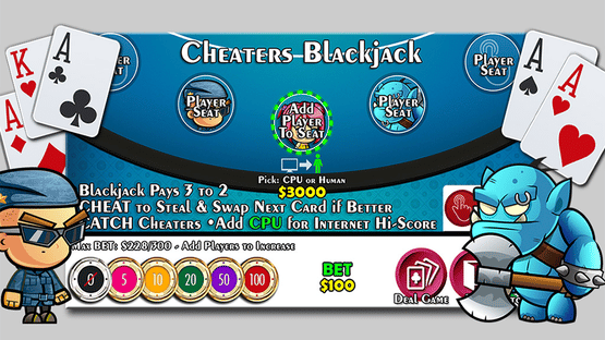 Cheaters Blackjack 21 adds the 'cheating' twist to the classic game. Play 100% fair or against cheating CPU opponents to Win Match Play. Compete against players worldwide to post the best match totals. The game features 6 exciting blackjack game modes.