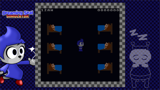 Dreaming Seal Simulator is a retro-style arcade game where you play as a seal of dreams and you have to calm down each kid that has a bad dream until the in-game time of 6AM - every 500 points can advance you towards that time.