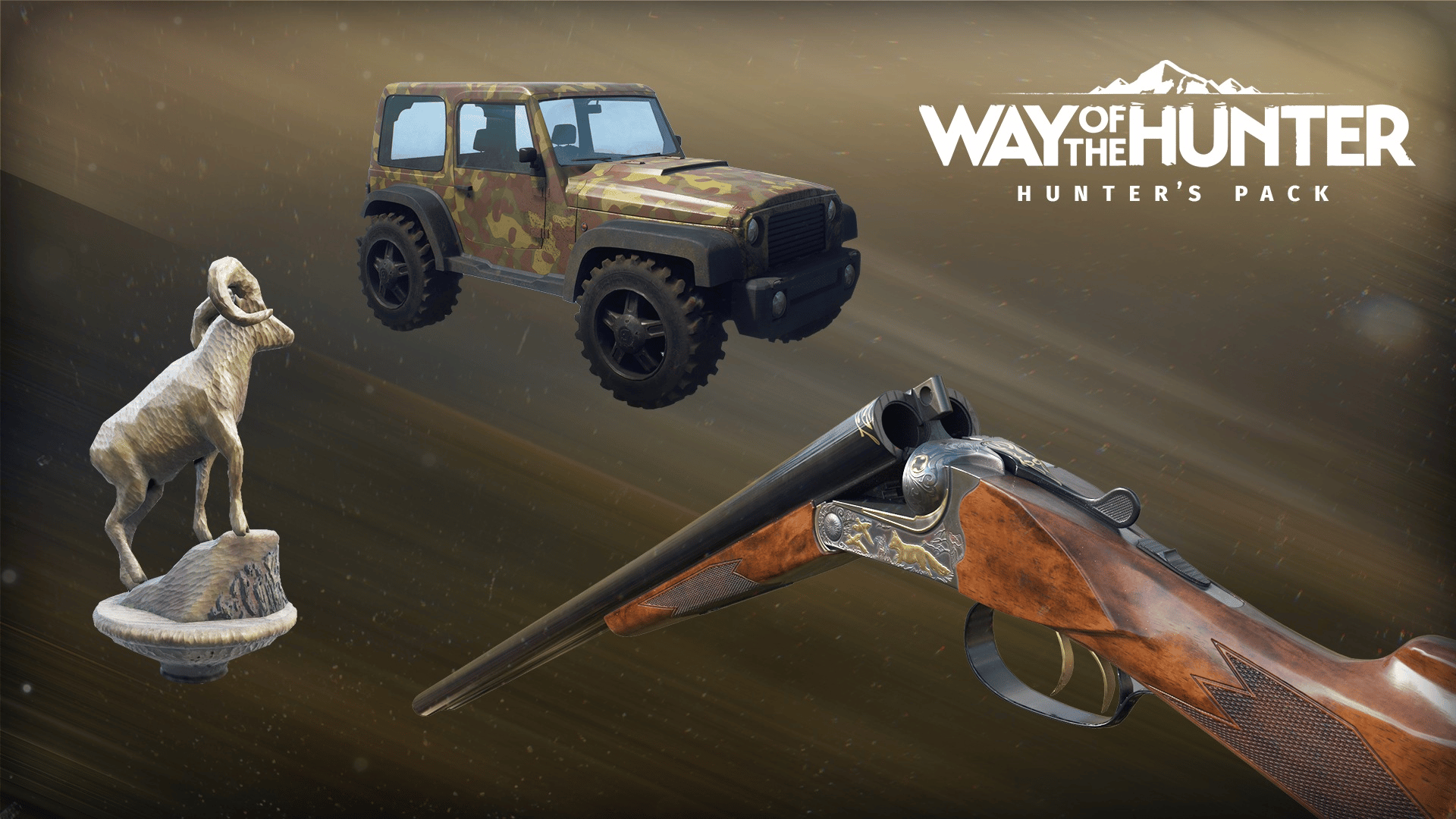 The Way of the Hunter Hunter's Pack: • a shotgun, with engravings. • a paintjob for the Car. • a big wooden carved mouflon statue for the lodge. This DLC is also part of the Map Pack 1 and the Elite Edition.