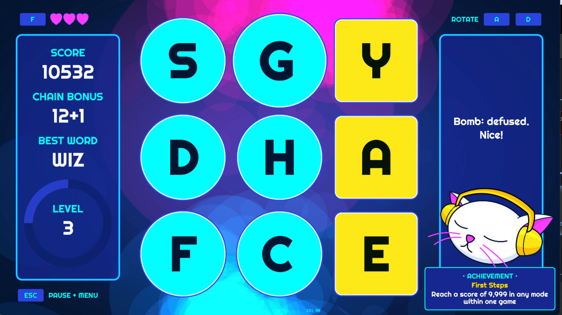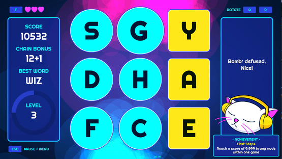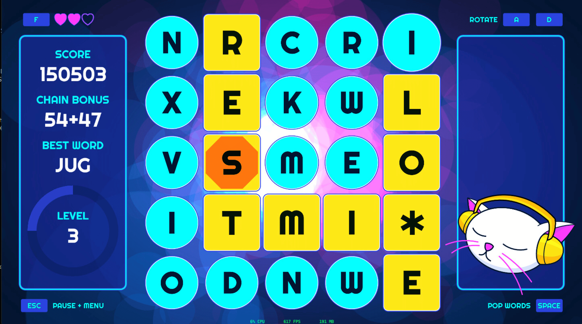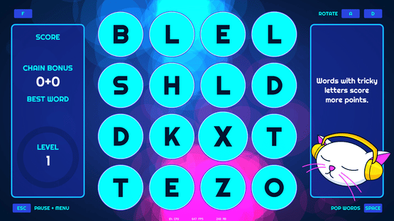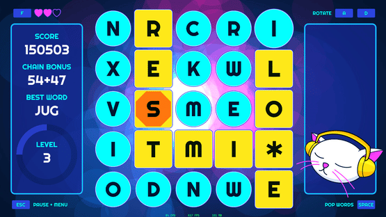 Word Rave is a fast-paced word game with a killer soundtrack. Form words quickly in thrilling "Rave" mode or chill out with increasing difficulty in "Chill" mode. Featuring a cute cat mascot, get ready to unleash your inner wordsmith!
