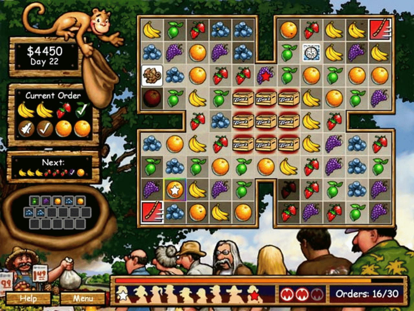 The opening of a large, unfriendly MegaMart across the street has put Tino's family fruit stand in danger of closing! With a little help from Rikki, the fruit-picking monkey, your job is to help him fill orders and keep customers happy. Fill orders correctly to get bonuses, but don't slow down or let the fruit sit for too long -- that will lead to unhappy shoppers and cost you the family business. Use your power-ups wisely, make the right decisions and you'll grow more than fruit ... you'll grow an empire!