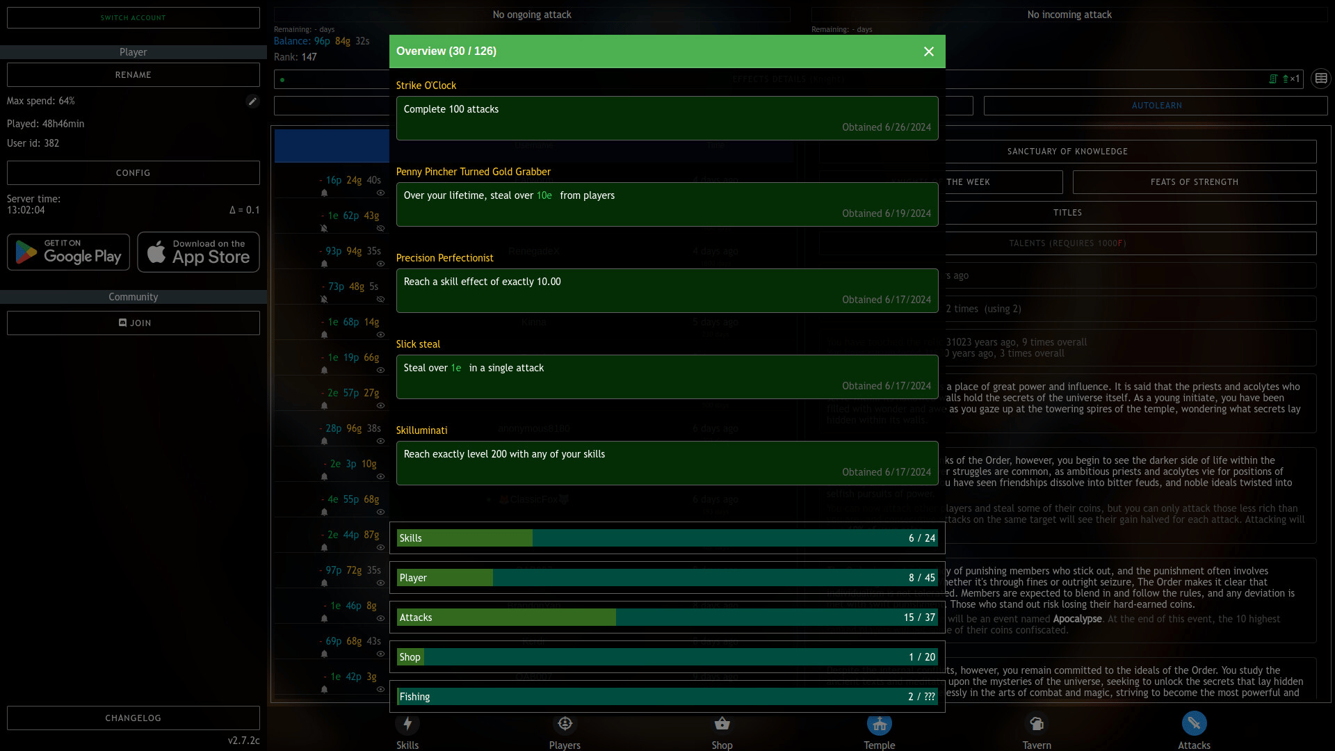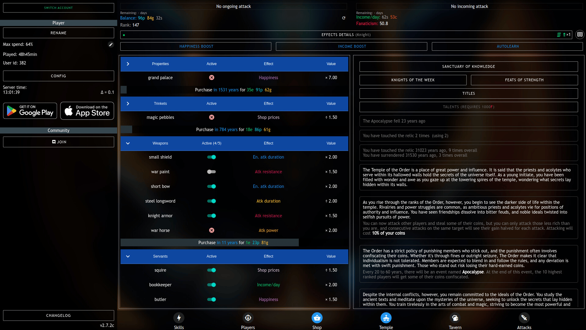 Progress Knight: Multiplayer is an exciting incremental player versus player game that builds on the success of its predecessor, Progress Knight: Mobile. Set in a rich fantasy/medieval world, players must gather gold and progress their skills to fight against their opponents. As a novice of The Order, you start at the bottom rung of the ladder. However, through your faith and dedication, you can discover new skills and abilities that allow you to overpower your rivals and climb the ranks of The Order. You must choose whether to rely on their wits and skills alone, embrace your belligerent side, or use your dedication to deter potential attackers.