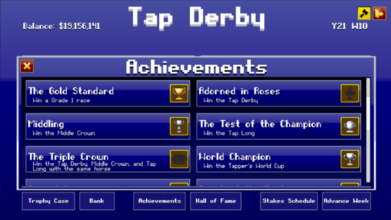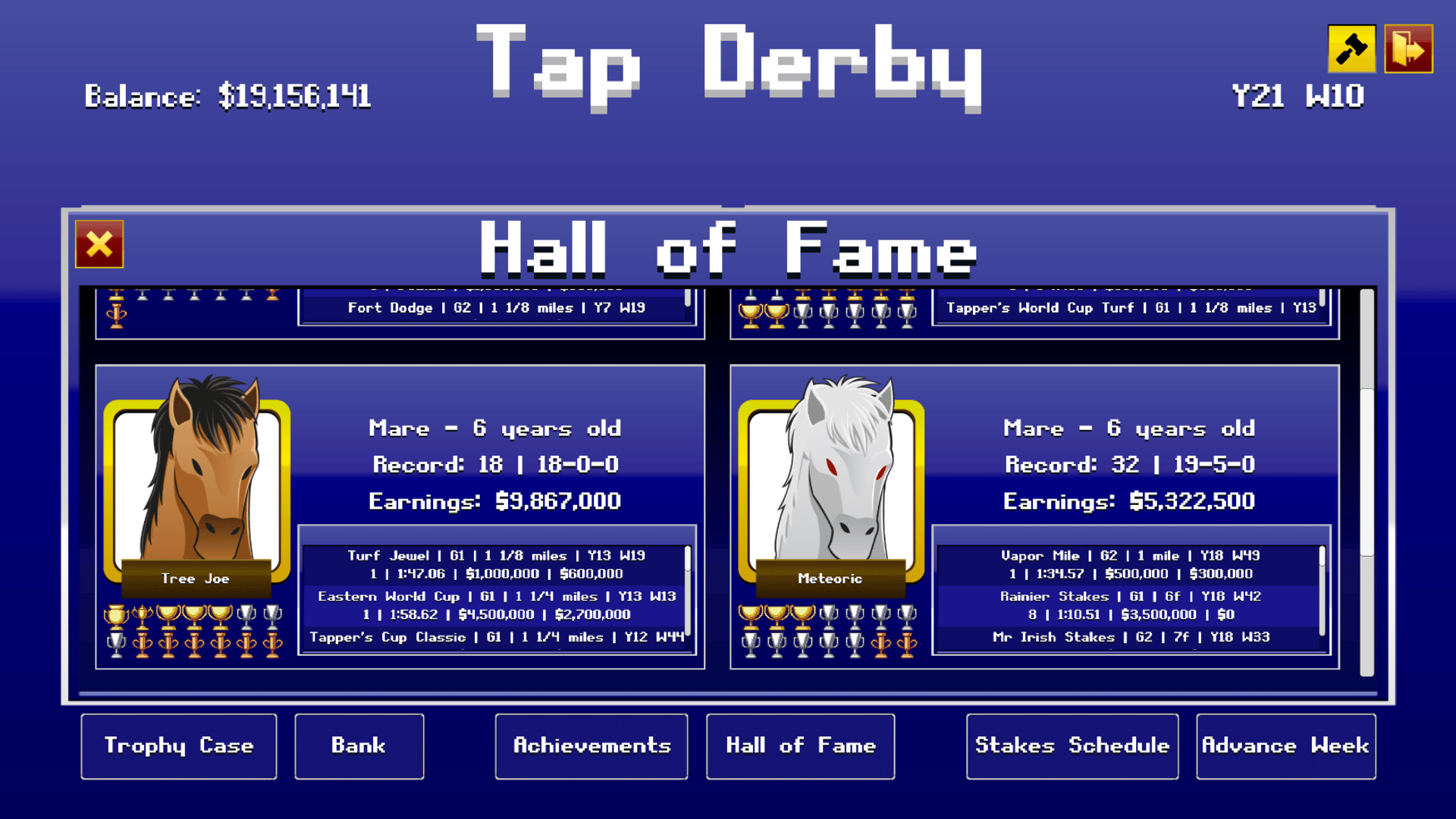 Tap Derby allows you to step into the shoes of a rookie horse trainer. Under the guidance of legendary trainer, Rusty Hayes, buy, train, and race as you grow your stable. Conquering prestigious racing events and rising to Horse Racing Stardom.