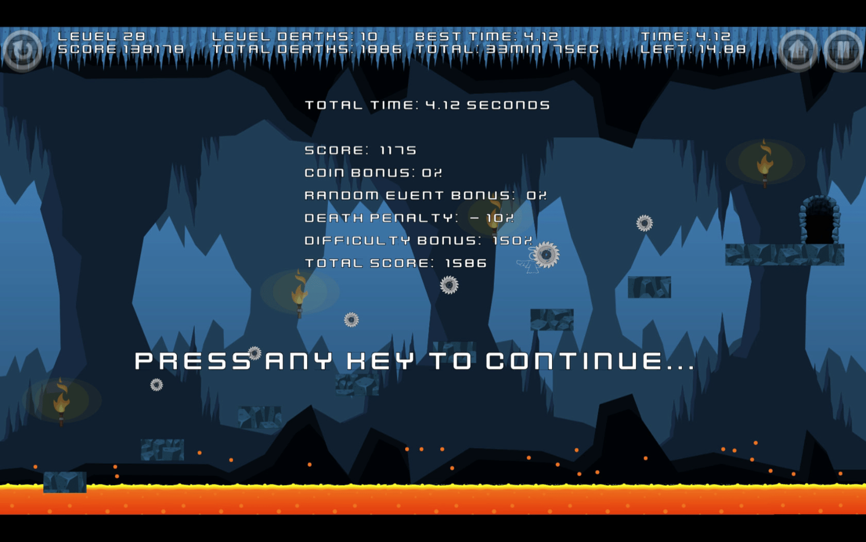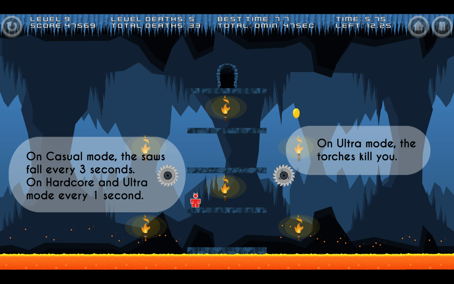 100 levels with three difficulty levels - Casual, Hardcore and Ultra mode. On Ultra Mode, we take no responsibility for any broken keyboards or gamepads.