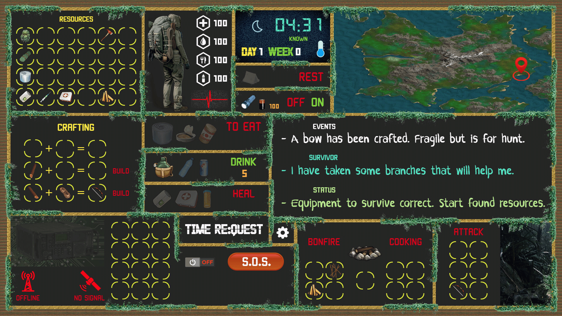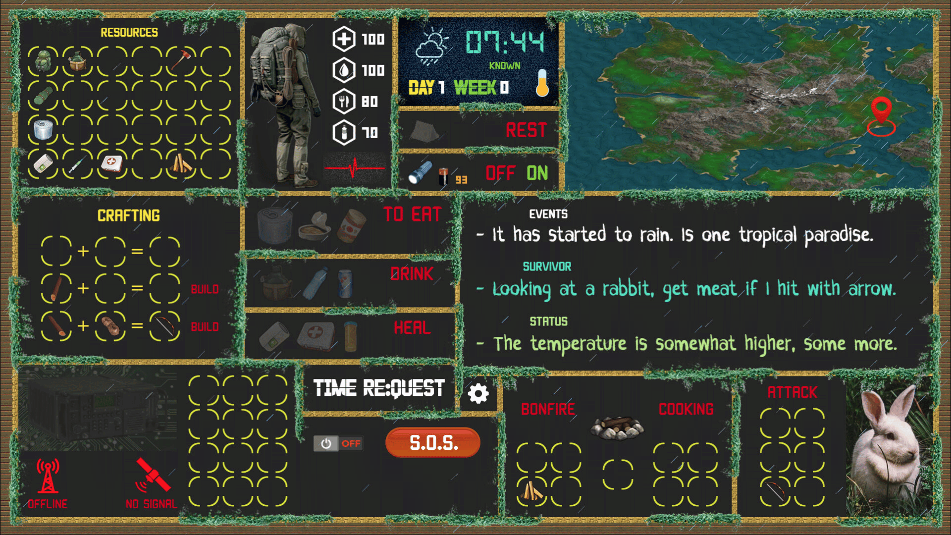 A survival game with a classic style of the graphic adventures of the 80s. Current graphics, updated to the new generations and with a simple way to play. Two game modes. Discover your way and one great game. Procedural game, it is generated as you progress. Every game is different. Survive!