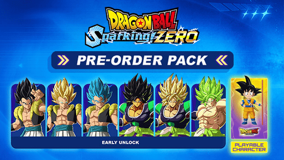 The Pre-Order Pack includes the following content for DRAGON BALL: Sparking! ZERO: - Exclusive new playable character: • Goku (Mini) - Early unlock of the following six characters: • Gogeta • Gogeta, Super Saiyan • Gogeta, Super Saiyan God Super Saiyan • Broly • Broly, Super Saiyan • Broly, Super Saiyan (Full Power) *Goku (Mini) voice over language is Japanese only.