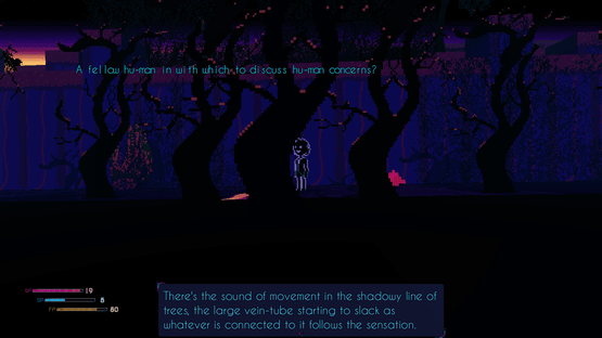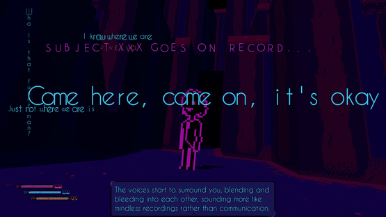 A jumpscare-free abstract horror existential crisis of a lite-RPG. Explore Digressions - areas that continue longer than they should with sets of randomized text events and map variations for a differing experience each time. Features a unique non-violent interaction system with various Entities.