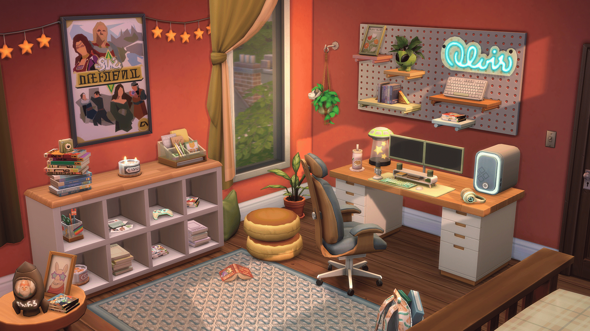 Settle in for a cozy time at the computer with The Sims 4 Comfy Gamer Kit*. With this collection you’ll craft warm, inviting spaces that feel personal with a large desk, playful clutter items, and of course a comfy gaming chair. This kit was created in collaboration with Lilsimsie to be fun and relaxing with subtle references to The Sims.