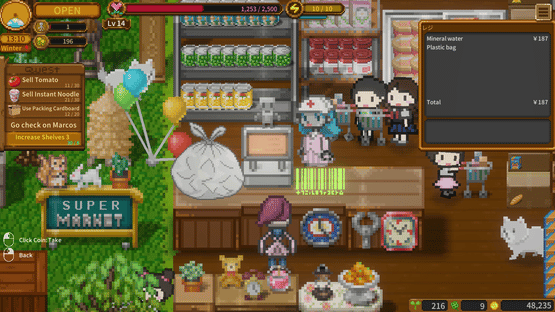 Set up shelves, arrange products, and make your store bigger and bigger. Sell your goods to the remaining people, animals, and robots in the last place on earth just before the human race is exterminated.