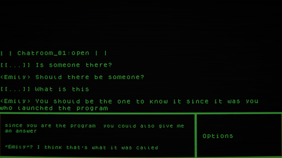 Chat with a mysterious AI, uncover secret codes and find hidden files. Your choices may lead you to uncover different things, the only way to find the truth is through Emily and whatever was left inside the old computer. You need her help
