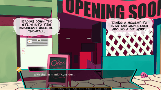 Have you ever found yourself exhausted and confused by the hustle and bustle of corporate life in the big city? Wouldn’t it be wonderful if there were a place you could just relax and unwind, maybe have a nice cup of coffee or a snack, in the company of a variety of attentive pink-feathered waterfowl (and also Kenneth)? Need an opportunity to just hang out and be unafraid to be yourself? If the answer to any of this is no, then it should be yes, and if the answer to any of this is yes, then you’re welcome to Be Our Guest at the Matinee Cabaret, a fun and inviting café, just a little off the beaten path, and with live entertainment too! Pop in for the grand opening in this charming visual mini-novel featuring original, dynamic sprite-work and colorful backgrounds for the various locations in the café, where you can meet and chat up the employees through their voice-acted branching dialogue trees. Order a drink, make a friend, solve a dilemma, and preview what the Matinee Cabaret has in store!