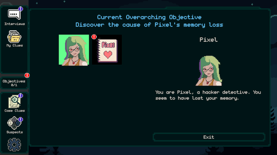 Pixel P.I. is a detective game that allows you to ask questions by typing in order to unlock answers from witnesses or suspects. It follows Pixel, a hacker detective who lost her recent memories and is going over past police cases trying to find any clue about her missing past.