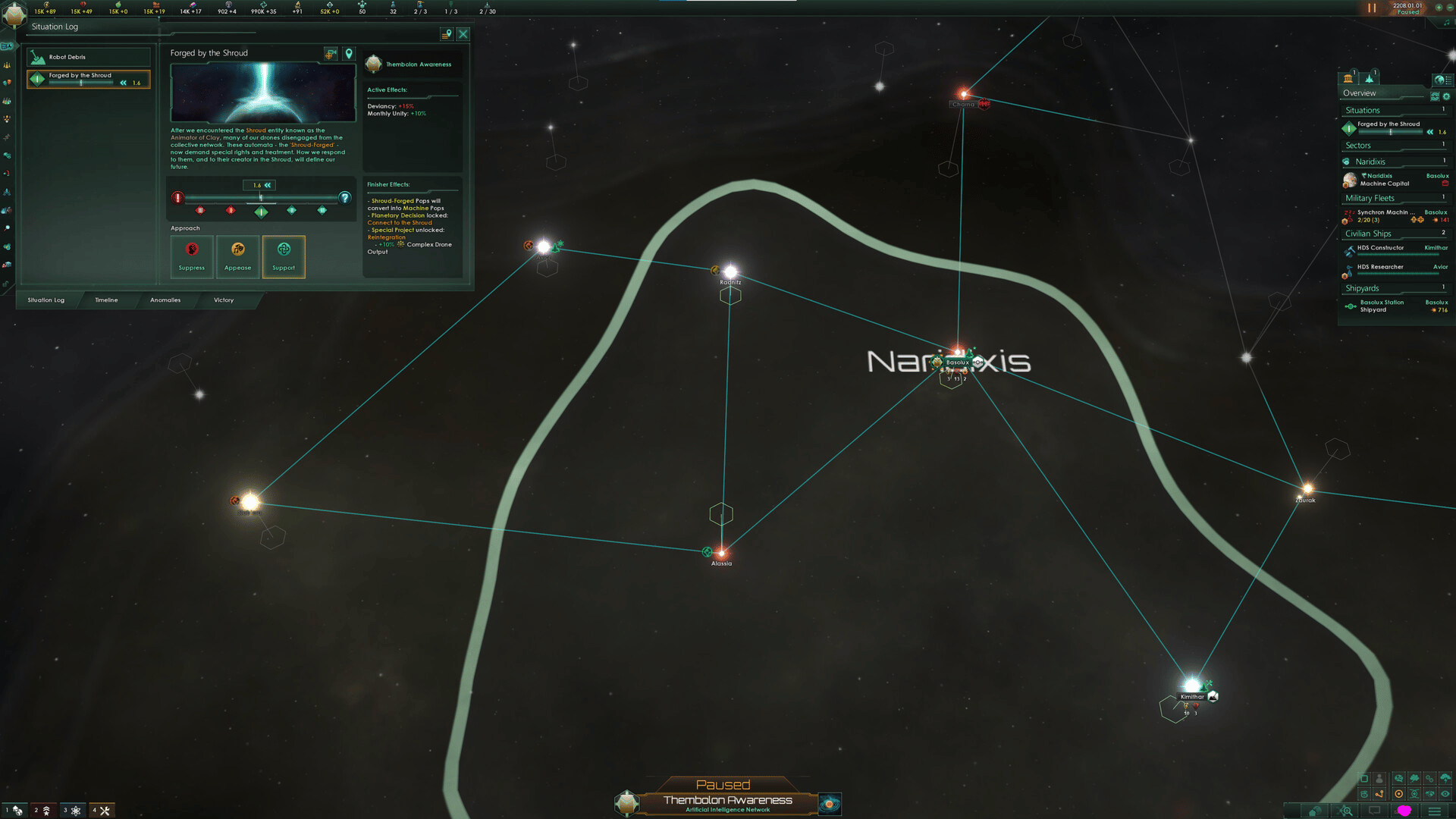 Shadows of the Shroud is an expansion for Stellaris, released as a part of the Season 09 Expansion Pass in 2025. The psionic plane holds untold power—but at what cost? Shadows of the Shroud is a complete overhaul of the Psionic Ascension path, introducing new moral dilemmas, patron allegiances, and the ever-present temptation of ultimate destruction.