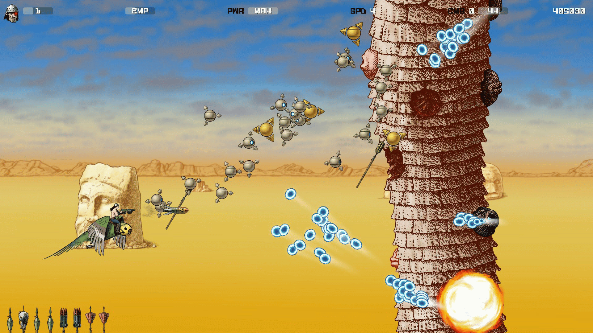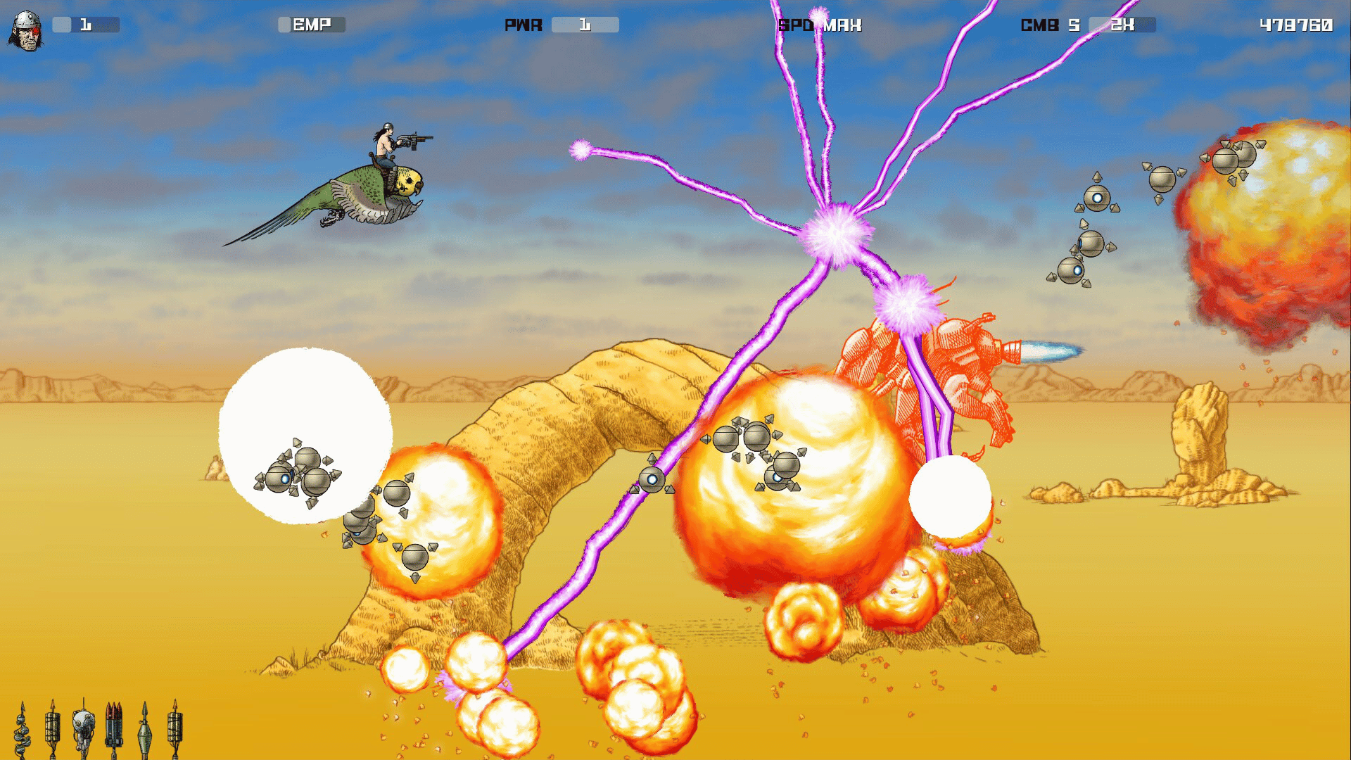 In a future Earth of machine overlords, warrior chieftain Ramek enacts a terrible revenge upon his mechanical enemy. Fly Ramek's genetically-engineered war-budgie through five levels of non-stop carnage, from the irradiated sands of the Dead Zone, to the iron towers of Machine City.