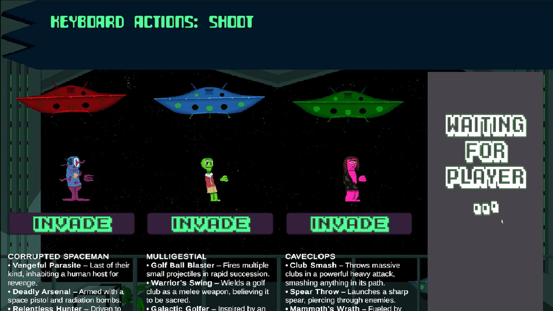 Lex Talionis A is a team-based, 4 player, couch co-op where aliens fight astronauts, drones, and bosses for revenge against humanity. Choose from four aliens with unique abilities and survive together in this 2D Run n' Gun Adventure.