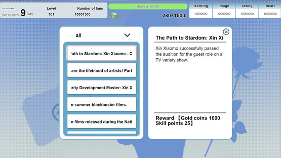 Star Dream Trajectory - Chinese Style Agent "is a celebrity development interactive game. As a new agent in a celebrity artist agency, you will encounter four artists with different personalities that you will be responsible for in your career, and cultivate them into legends in the industry