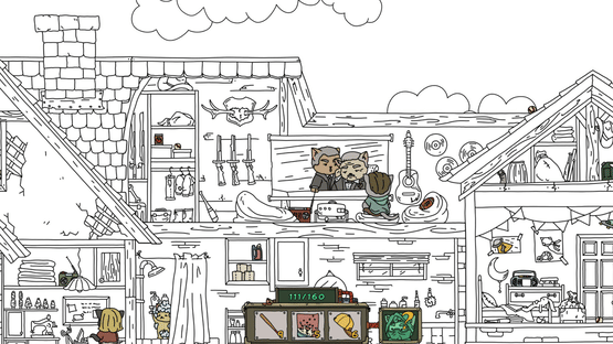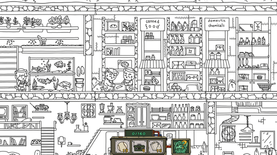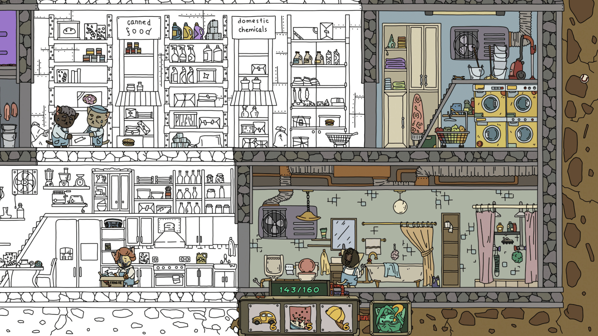Explore the underground bunker and the surface of the earth in anticipation of a nuclear explosion, finding various items and painting the black and white picture with colored inks.