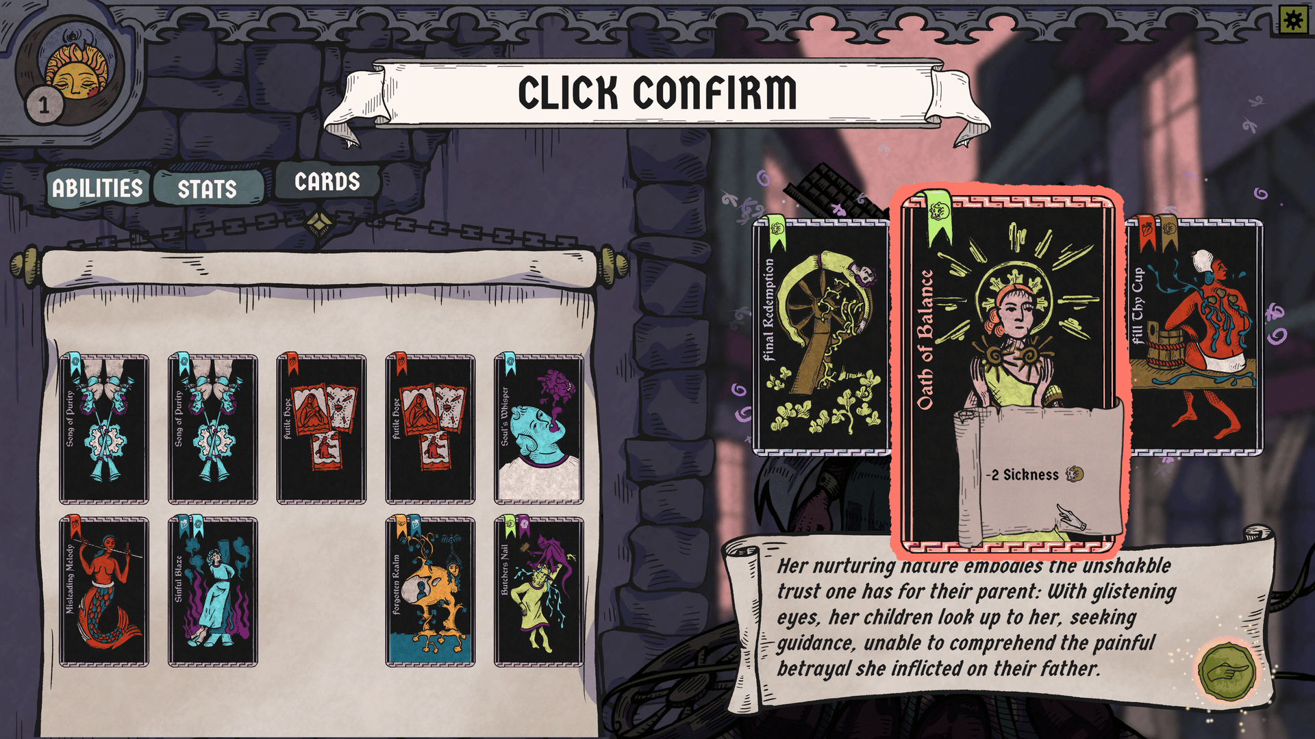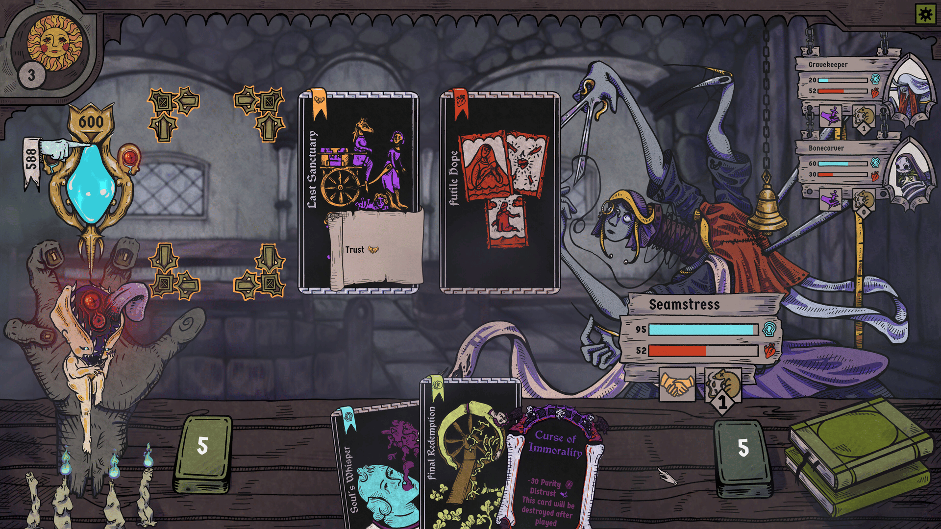 A grim medieval deckbuilder where you use your dubious healing methods to protect bizarre villagers from the corrupting influence of ancient evils.