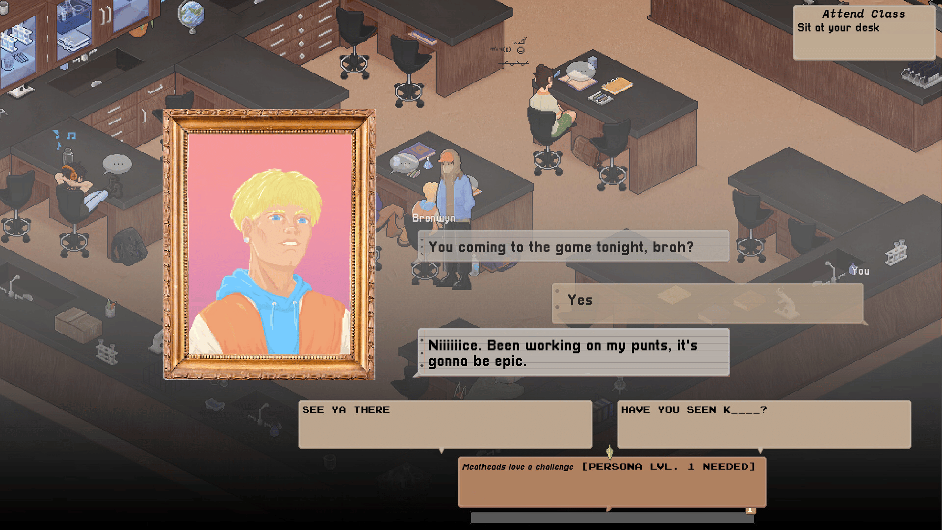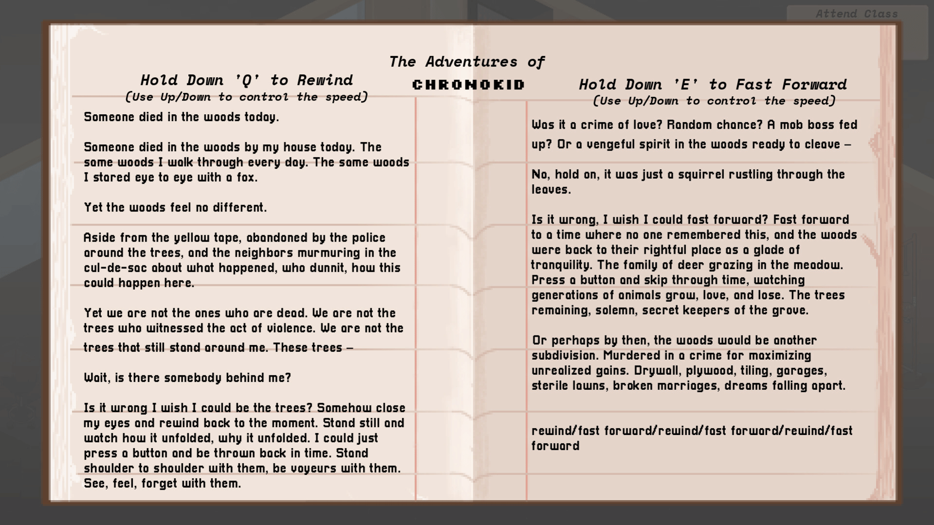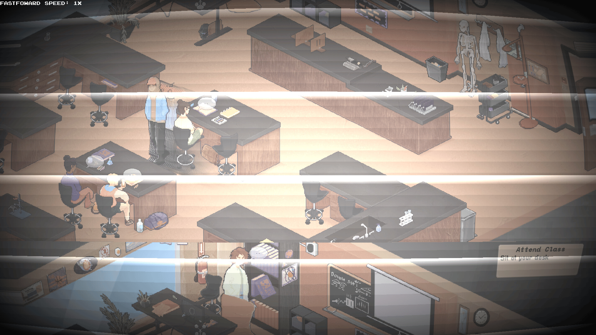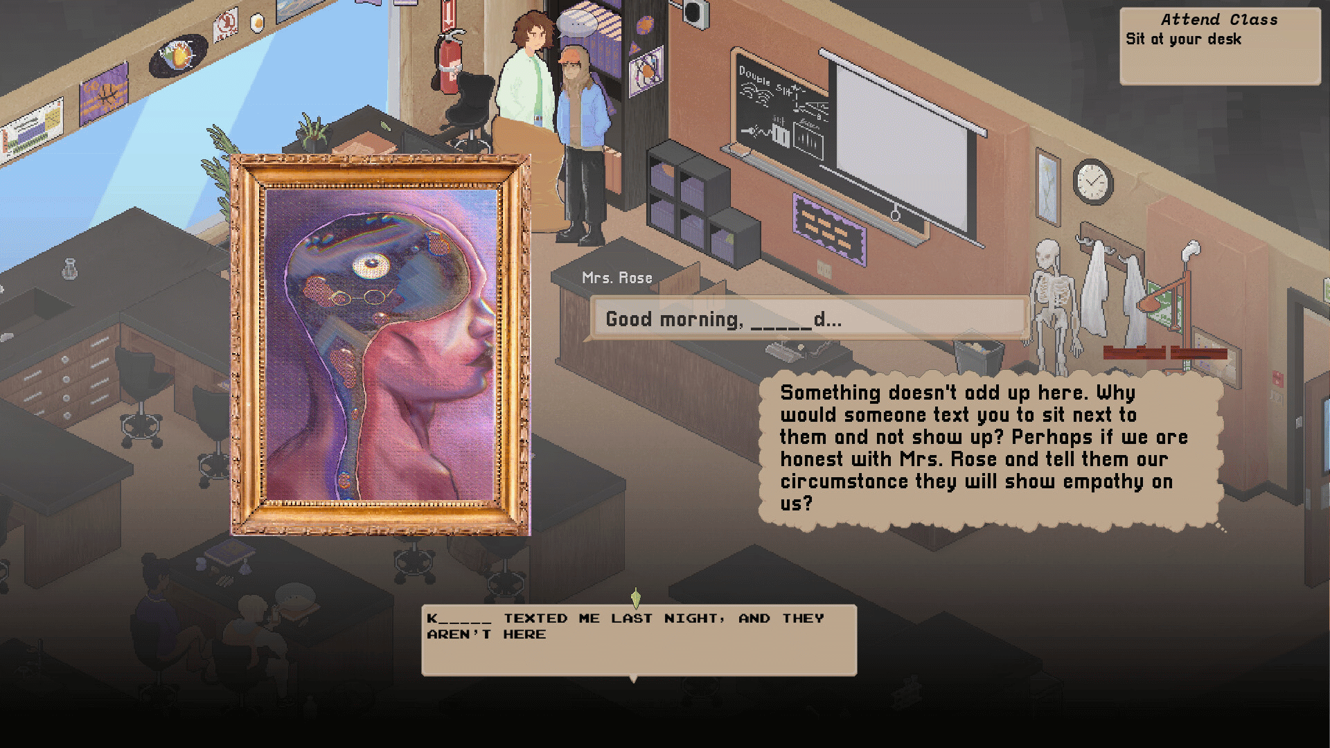 A mystery is afoot, a person has gone missing at Sunset High. Worst yet, they texted you last night. Even worse, you are stuck in a time loop. Hop in this narrative-driven, 2D, choose-your-own adventure game as you rewind and fast-forward through the dilemmas of being a high school student.