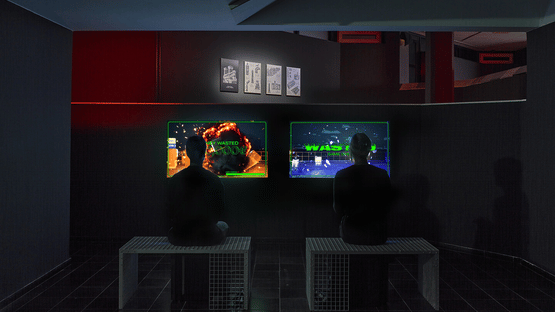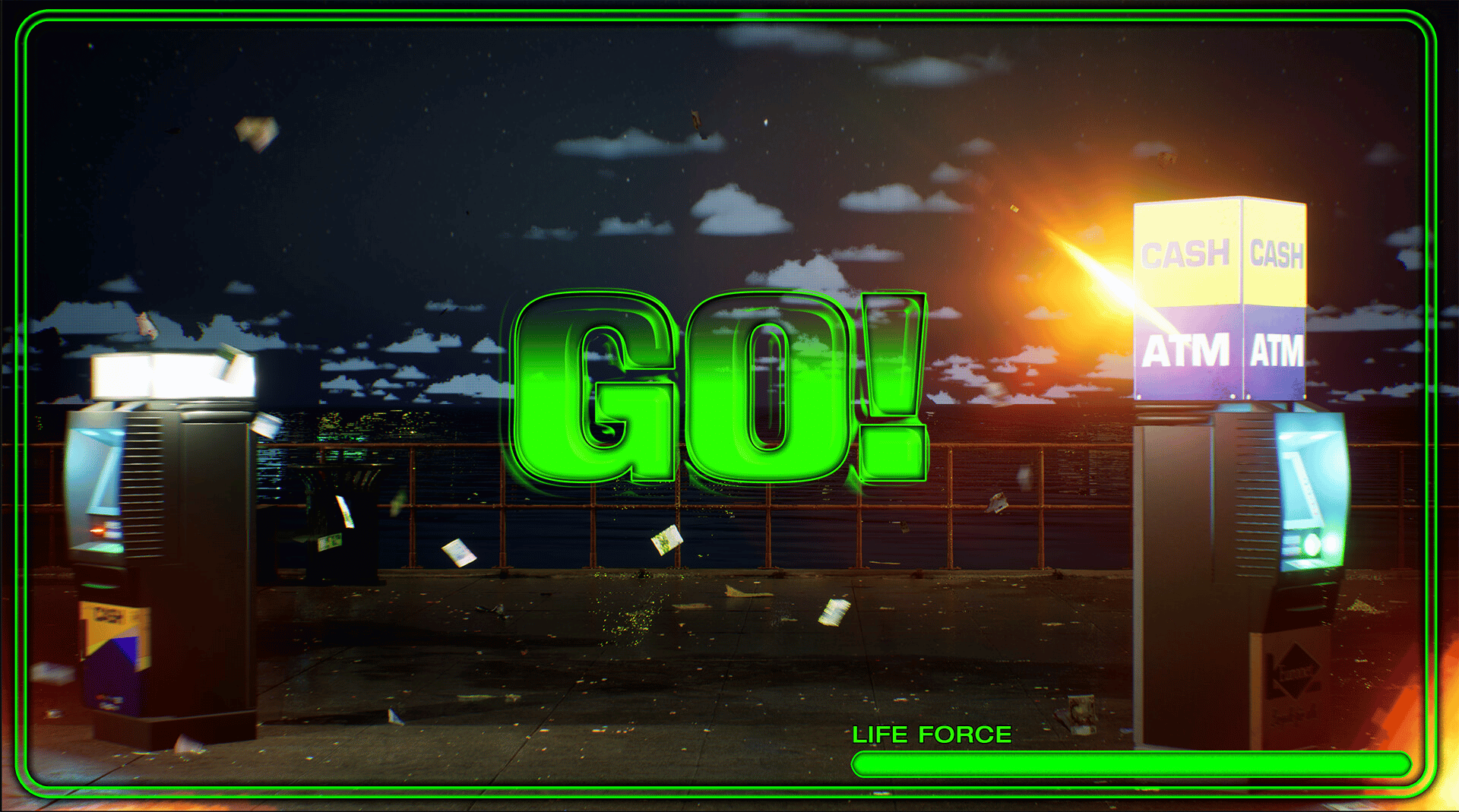 A surreal group of generic ATMs acts like bumper cars in an arena, roaming around set on a desolate square quay in an infinite ocean. As a first-person player, you ram into other bot ATMs before they hit you. This is an indie art video game by Studio Alona Rodeh, Berlin, Germany.