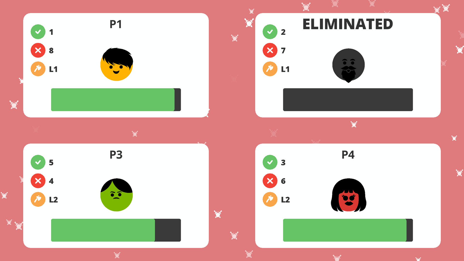 The ultimate trivia showdown! Compete against friends or the CPU in a high-stakes contest where answering questions isn’t just about being right—it’s about survival! Each correct answer lets you attack opponents and upgrade your weapon. Be the last player standing in this fast paced trivia brawl!